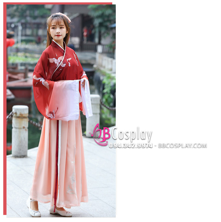Hán phục Hồng Hạc Du Xuân sẽ đem lại sự thoải mái cho người mặc vì chất voan, lụa rất thoáng khí và mềm mại. Trang phục bao gồm áo, váy và dây; có nhiều size, phần dây lưng còn có thể tăng giảm tùy ý theo số đo của người mặc.