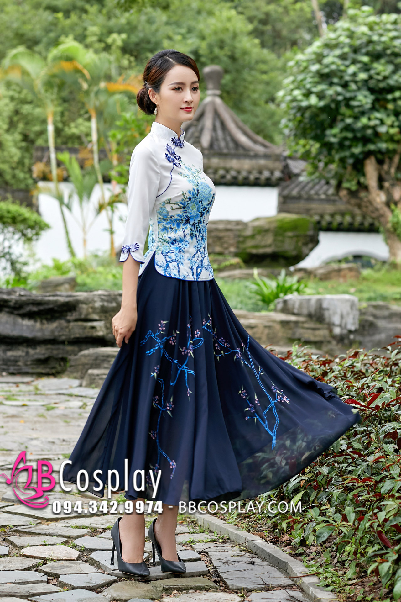 Váy Sườn Xám Cách Tân Hoa Sen- Xanh Đậm