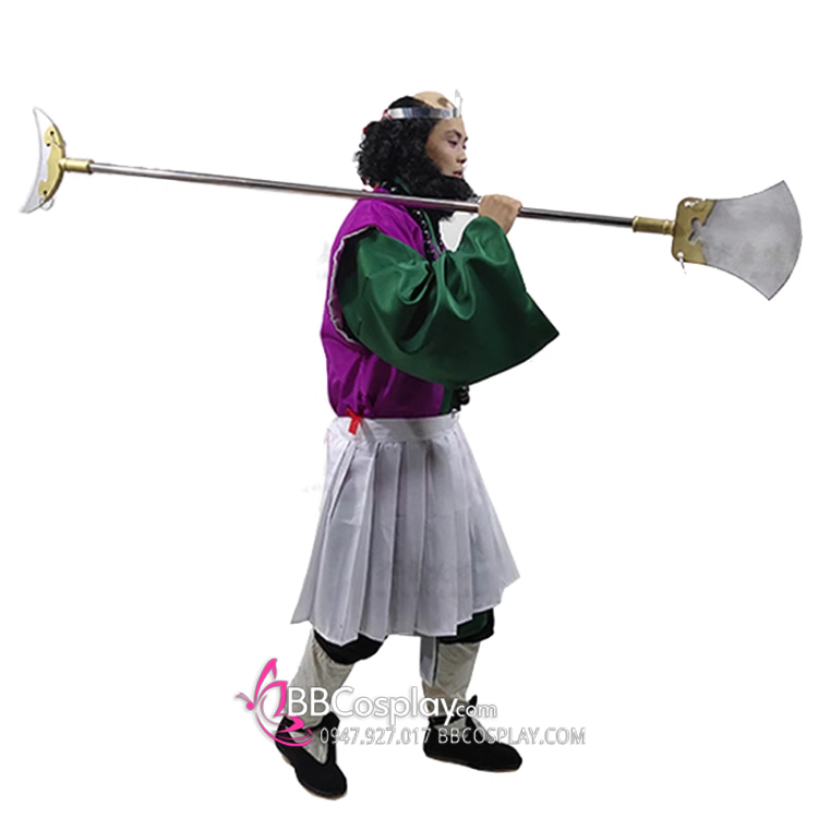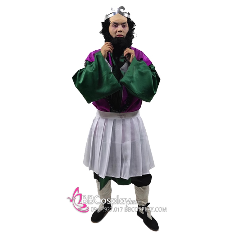 áo xanh lá + khoác tím + quần đen + váy trắng + vòng kim cô + vớ chân + râu + tóc giả + gậy + chuỗi hạt đeo cổ + giày cổ trang