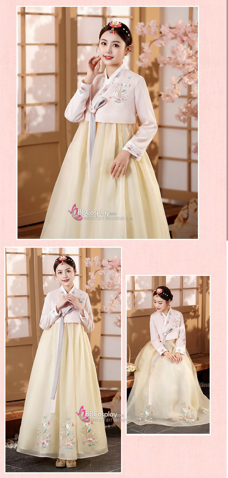 Hanbok Áo Hồng Cổ Thêu Váy Voan Vàng Thêu Hoa Mẫu Mới