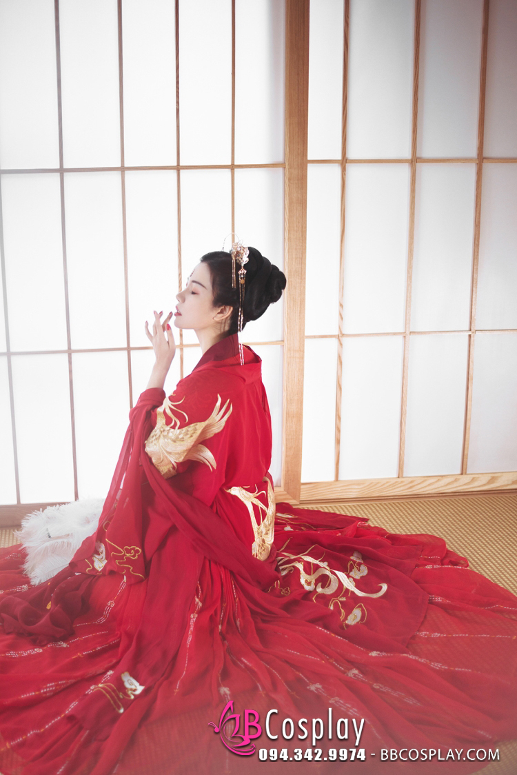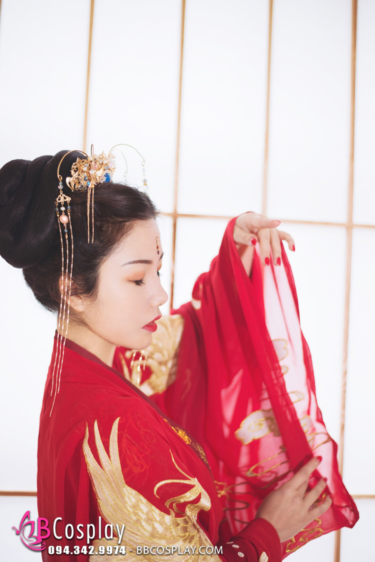 áo đỏ đắp chéo + váy đỏ thêu hoa + choàng thêu phượng hoàng