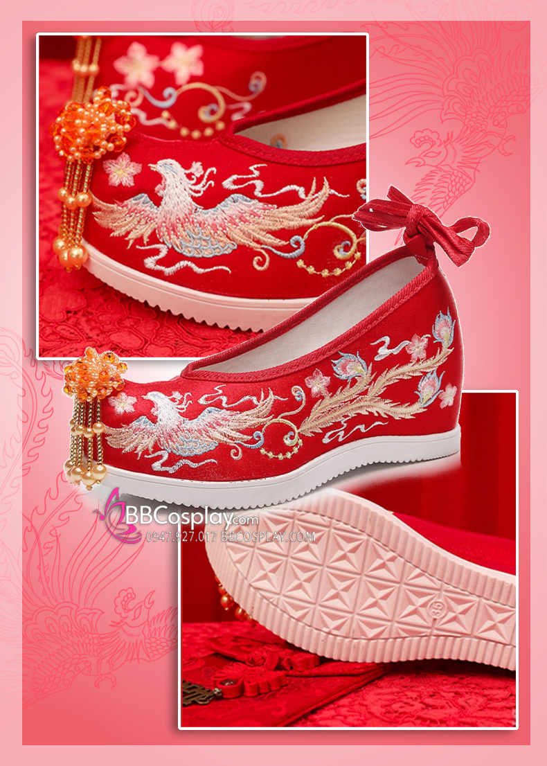 Giày Thêu Phượng Hoàng Đỏ Đế Cao 7Cm