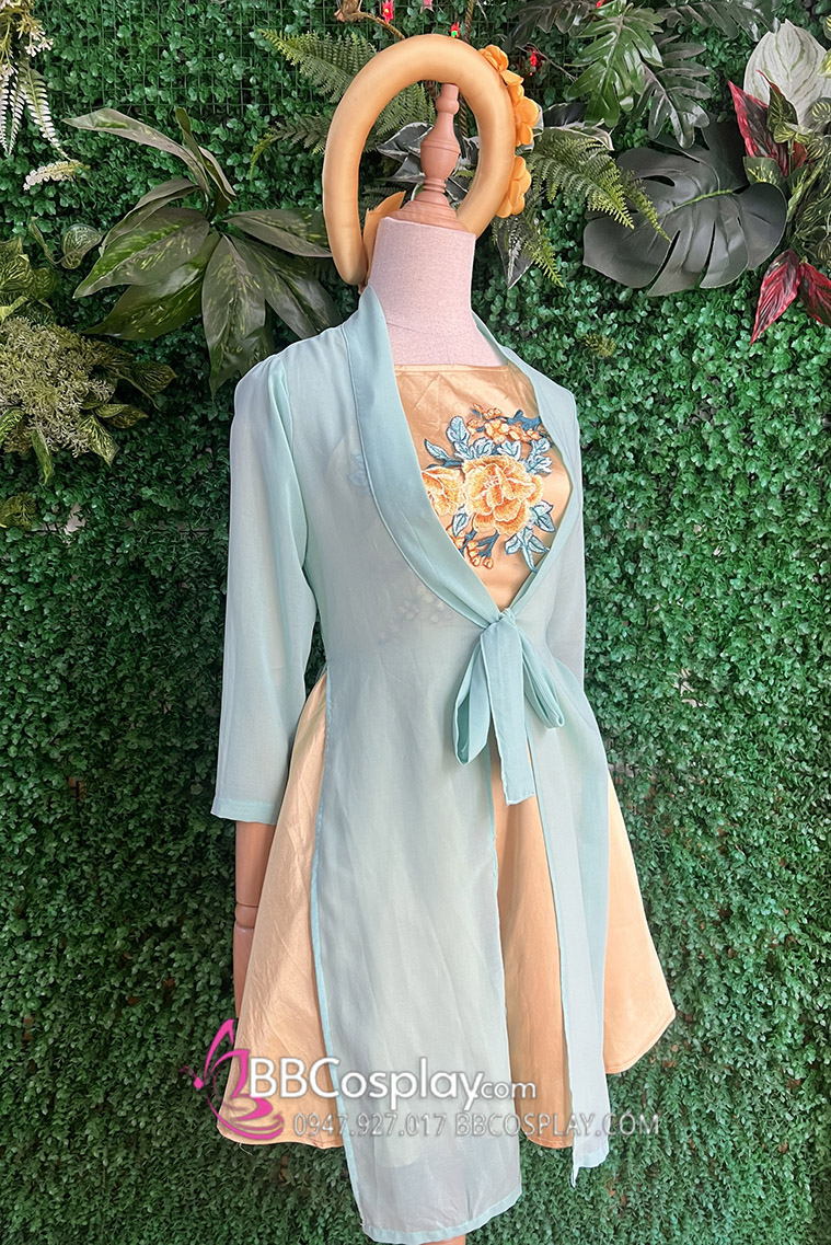Thành phần: váy vàng cổ yếm + áo voan cam + mấn