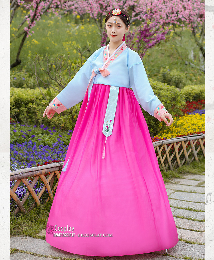 Trang Phục Hanbok HQ Đẹp Áo Xanh Váy Hồng Viền Carot Thêu Hoa