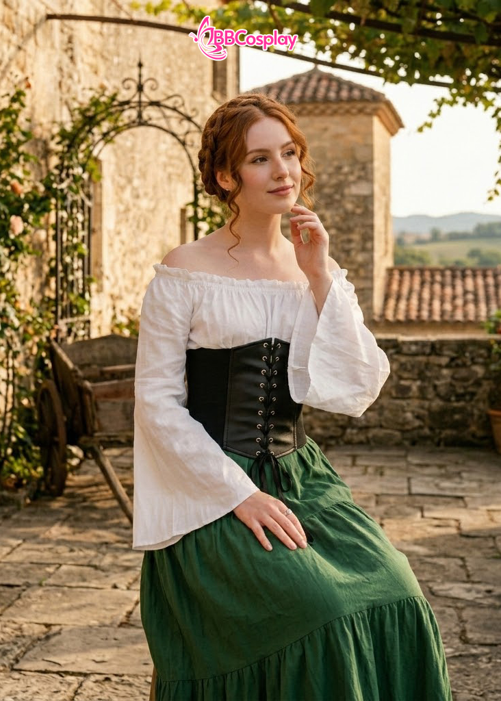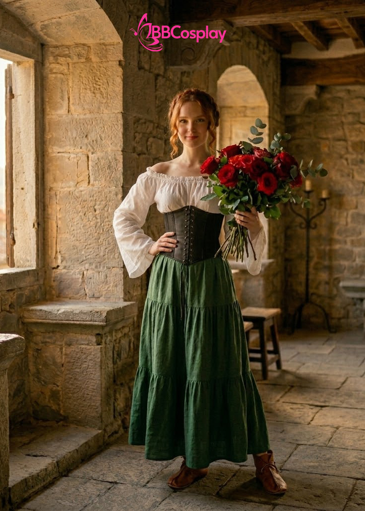 - Thành phần: áo trắng may liền váy xanh mạ + corset