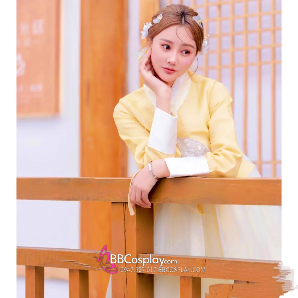 Hanbok Gấm Cao Cấp Chuẩn Hàn Áo Vàng Váy Trắng Kem