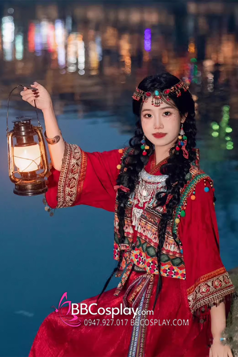 Thành phần: váy + áo trong vạt đắp chéo + khoác + lắc tay + cặp hoa tai + vòng trang sức đội đầu