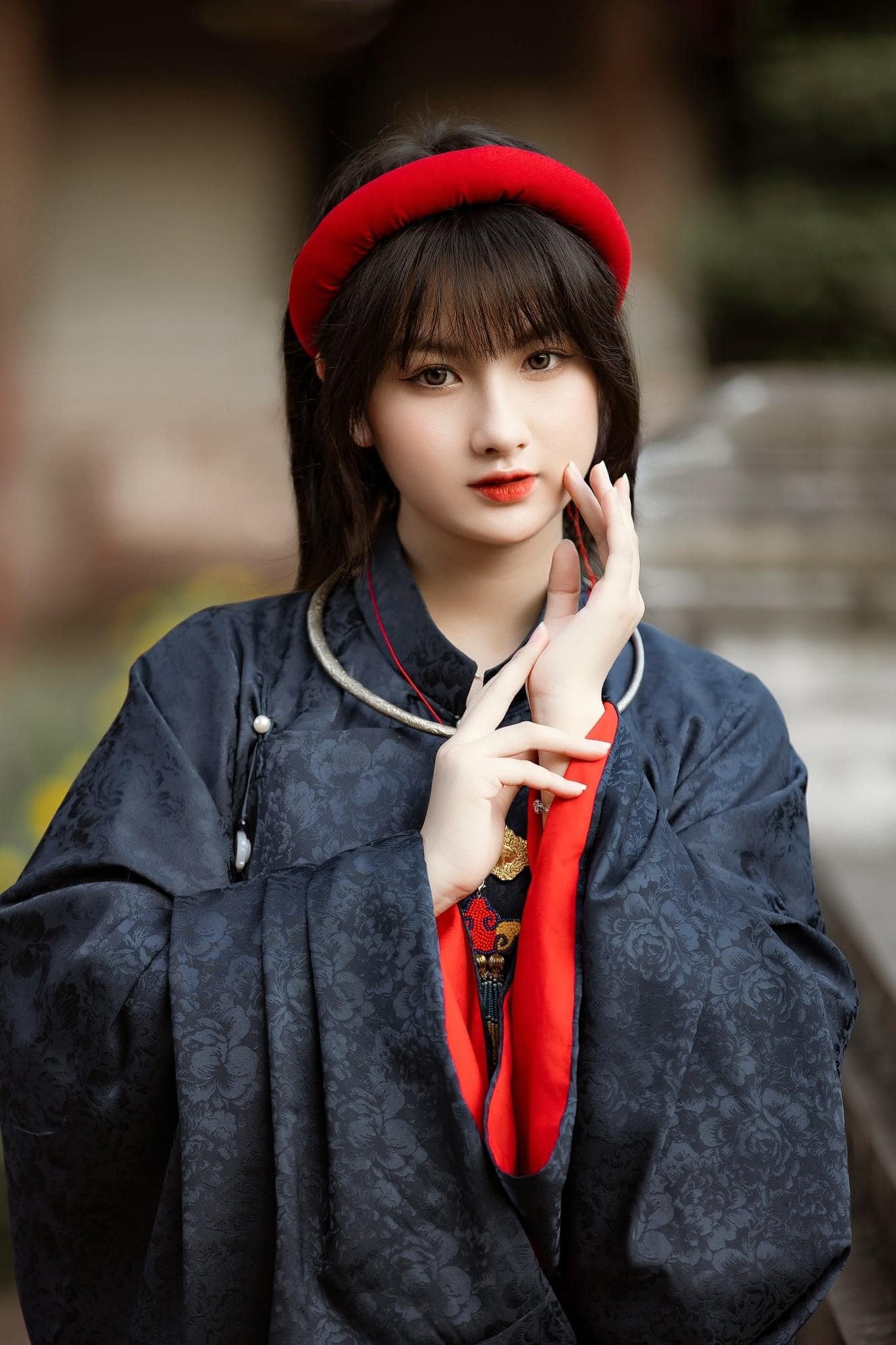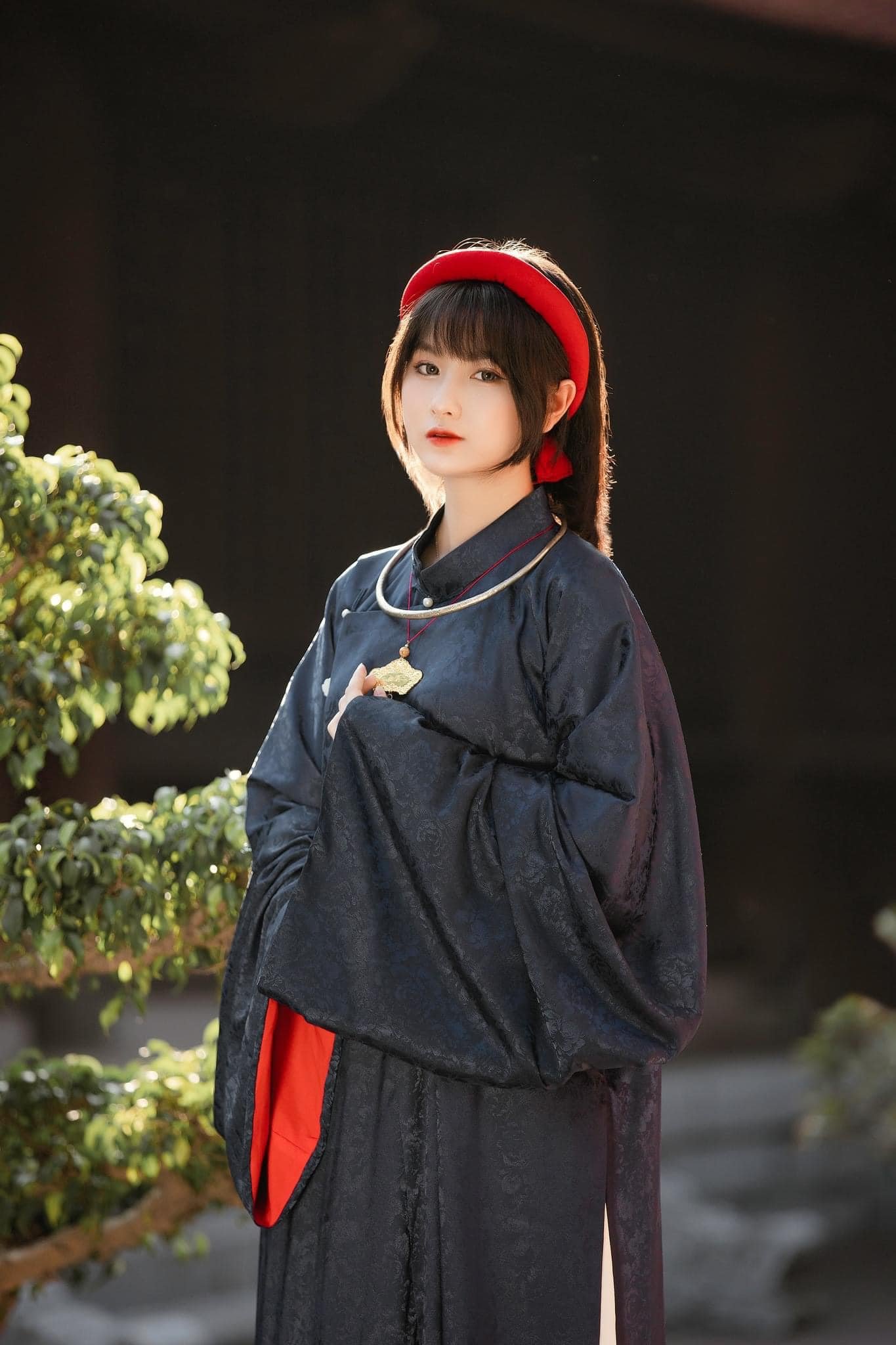 Việt Phục Nữ Triều Nguyễn Áo Ngũ Thân Đen Gấm Lót Đỏ Hoa Văn Chìm