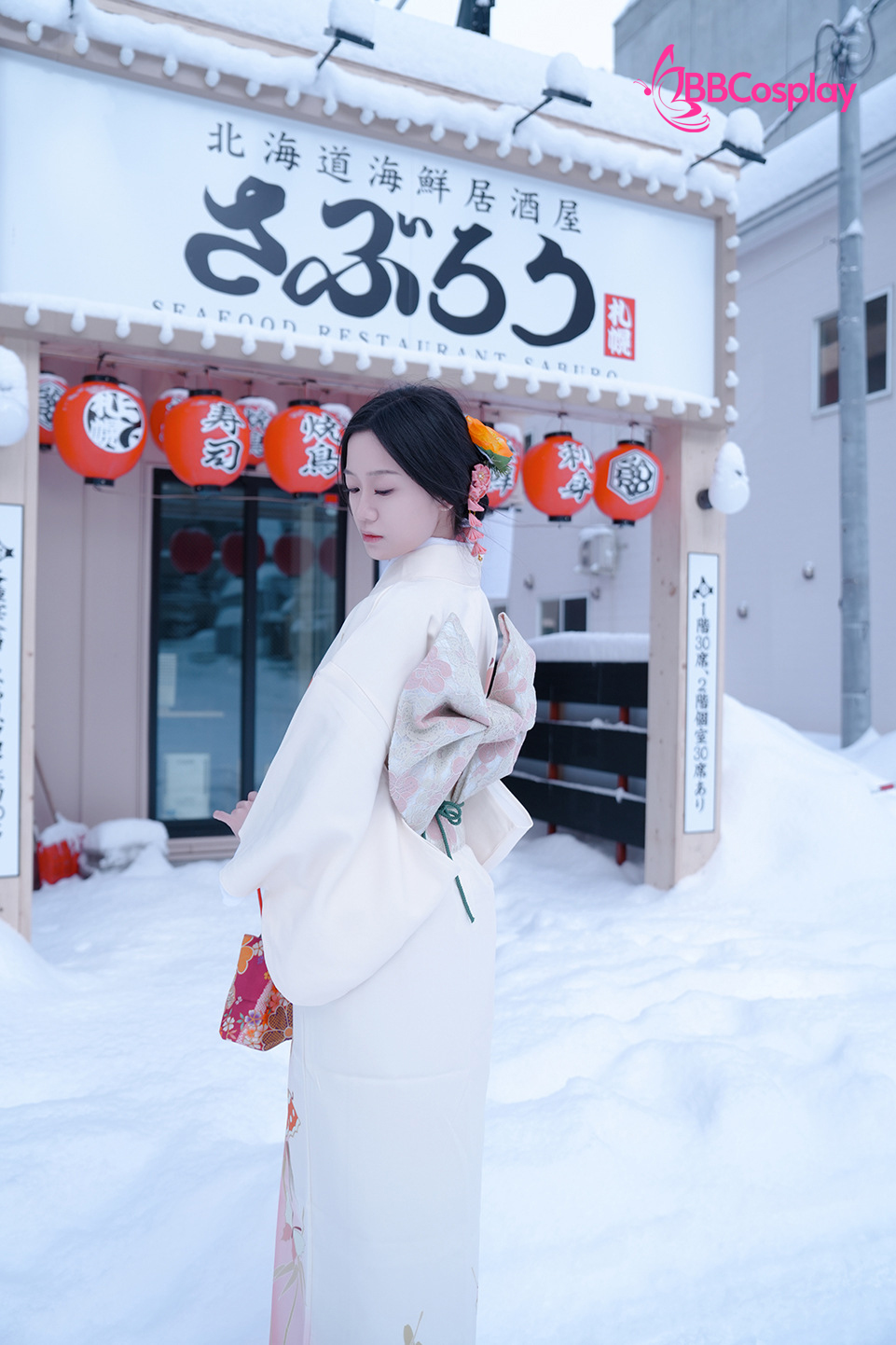 Áo Yukata Trắng Hồng Hoạ Tiết Bướm Nhẹ Nhàng