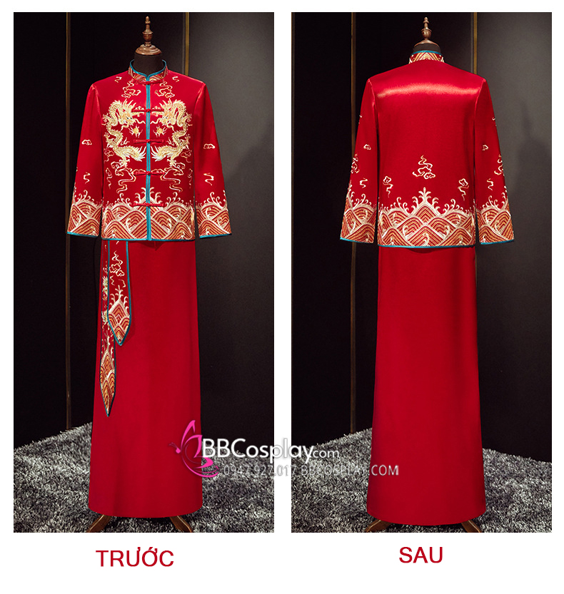 Trang Phục Tân Lang - Mẫu Đỏ Thêu Rồng Vàng Và Sóng Biển Viền Xanh Dương