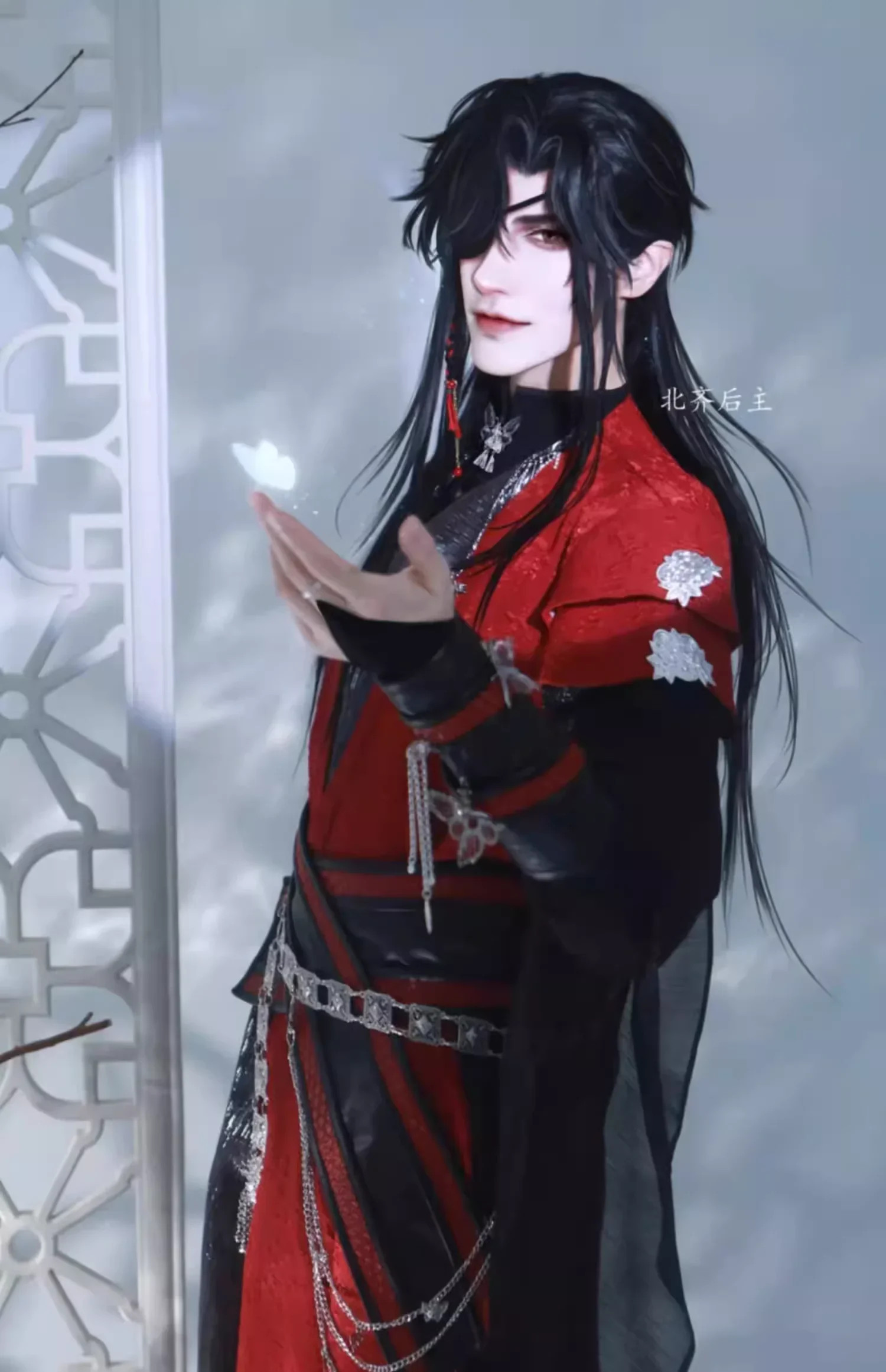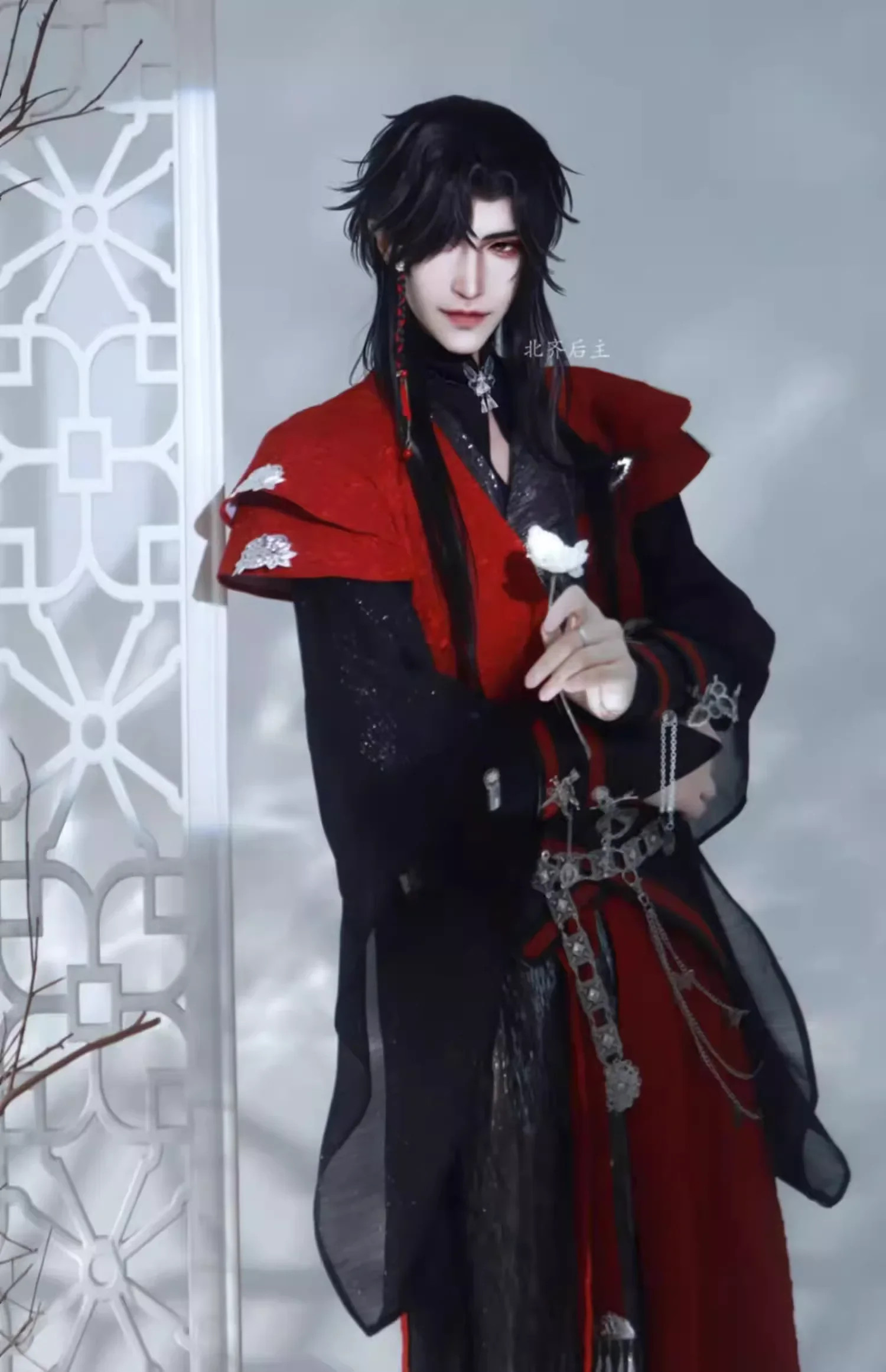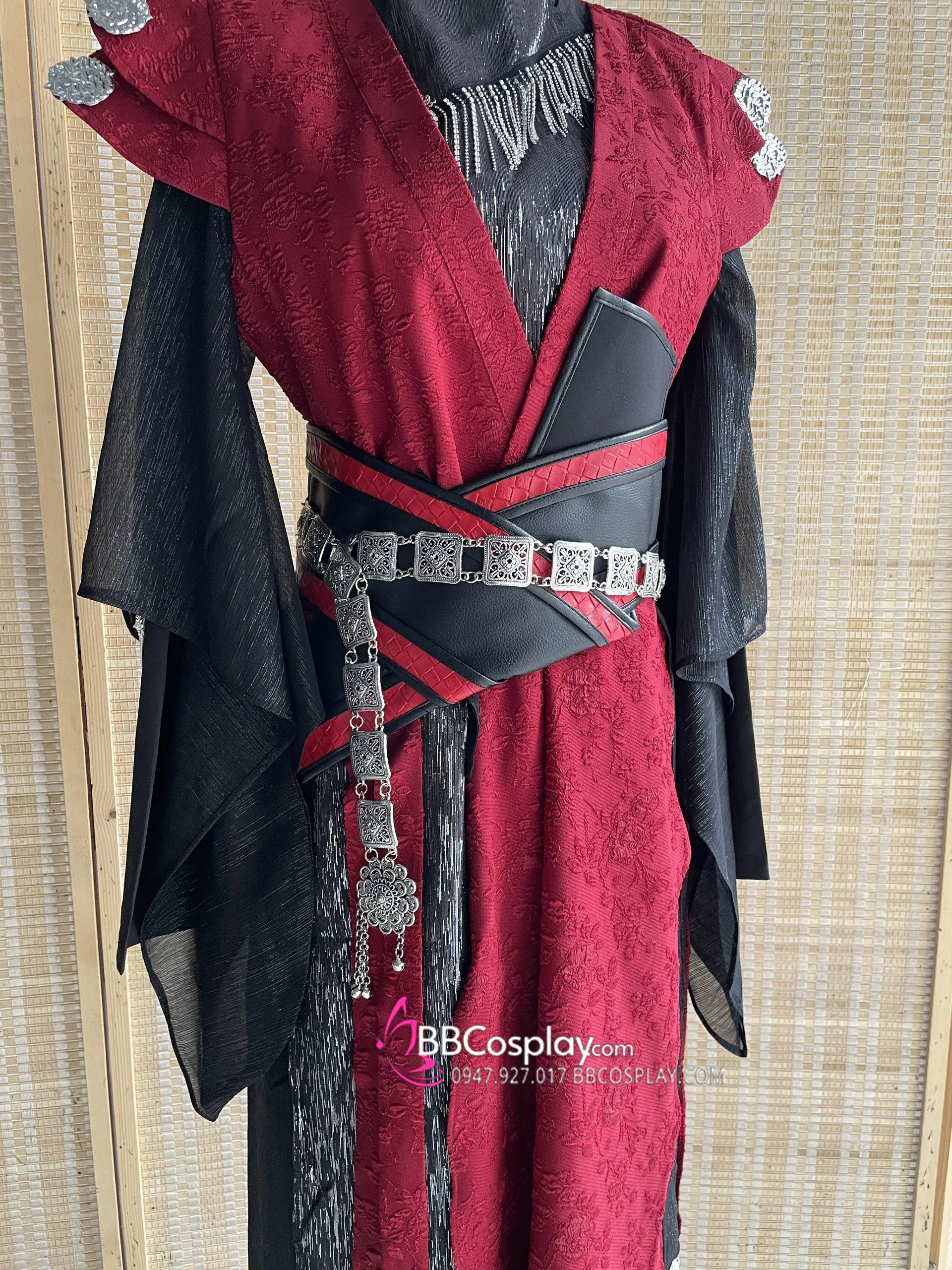 áo lót đen cúc tàu + khoác đỏ gấm + thắt lưng da + thắt lưng kim loại + dây xích kim loại + 3 kẹp bướm + 2 bao tay vải