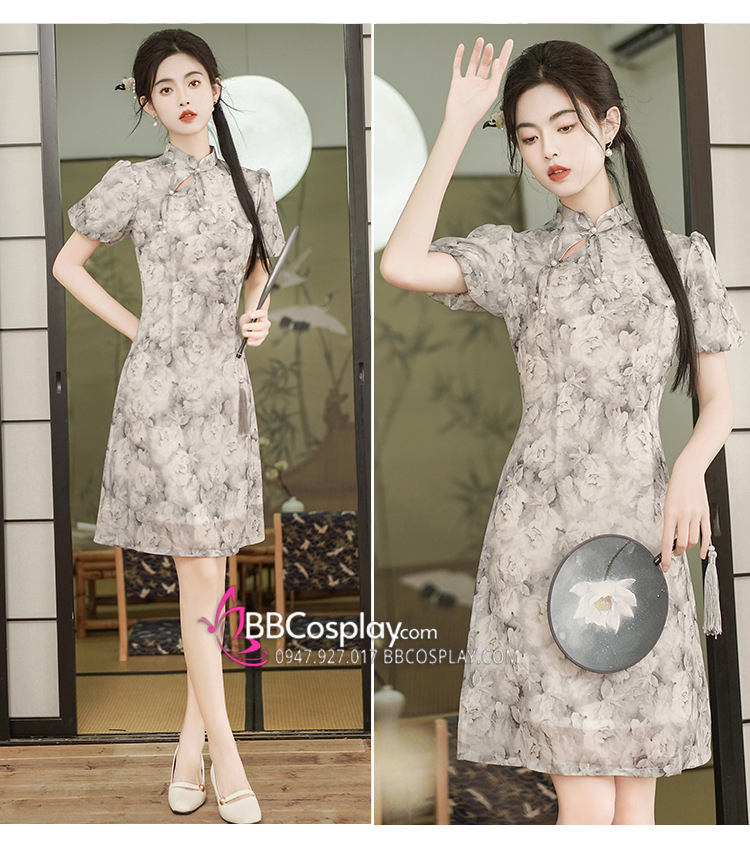 Sườn Xám Voan Nền Hoa Đen Trắng