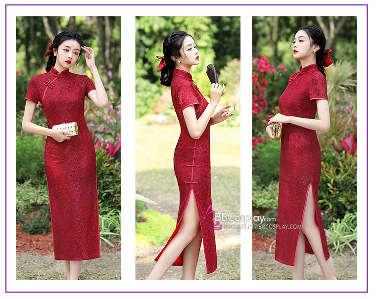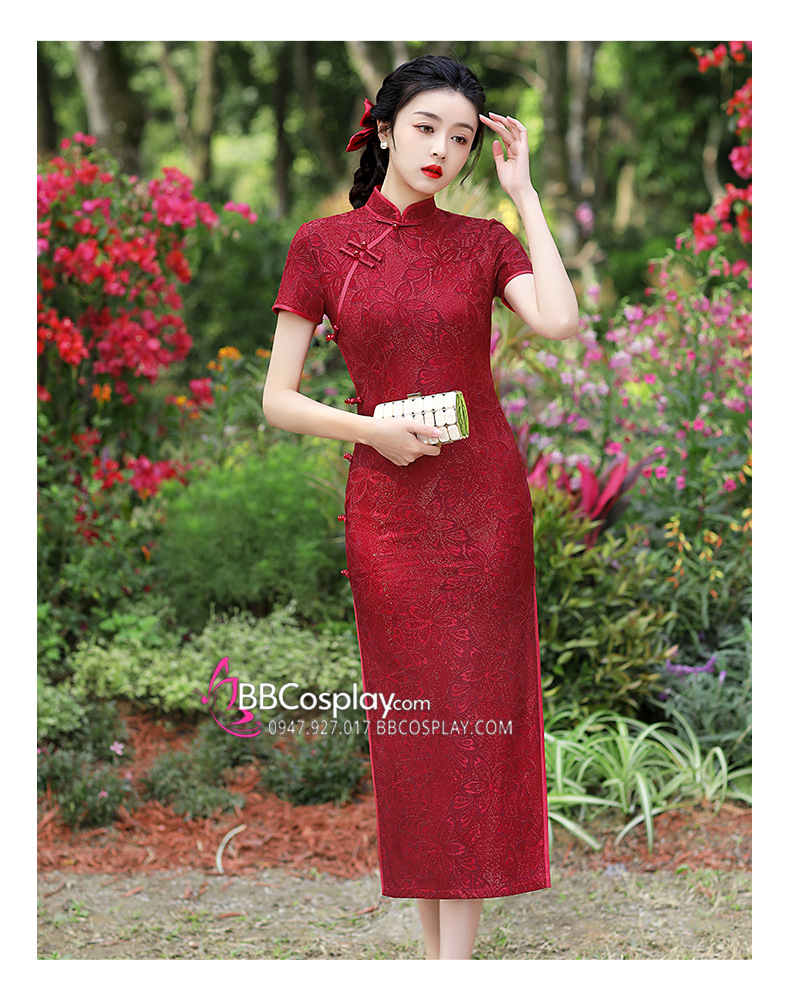 Sườn Xám Đỏ Dáng Dài Mẫu Ren Đỏ Hoa Lily