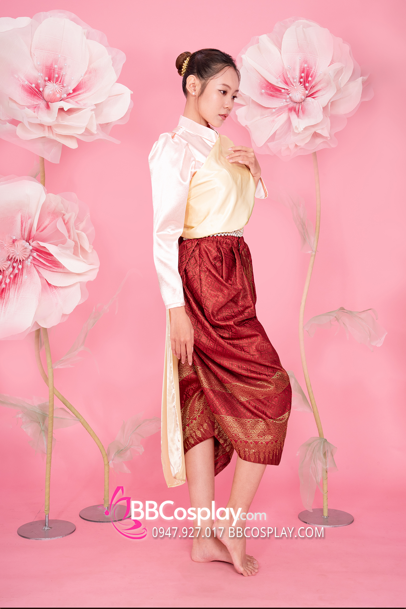 Trang Phục Khmer Áo Hồng Phần Saron Đỏ Gấm