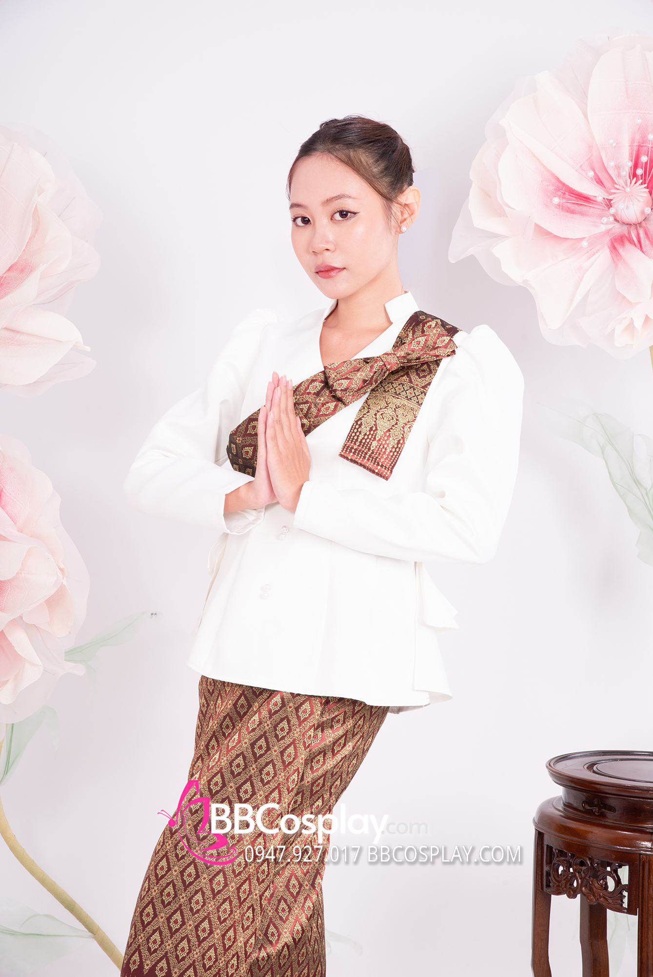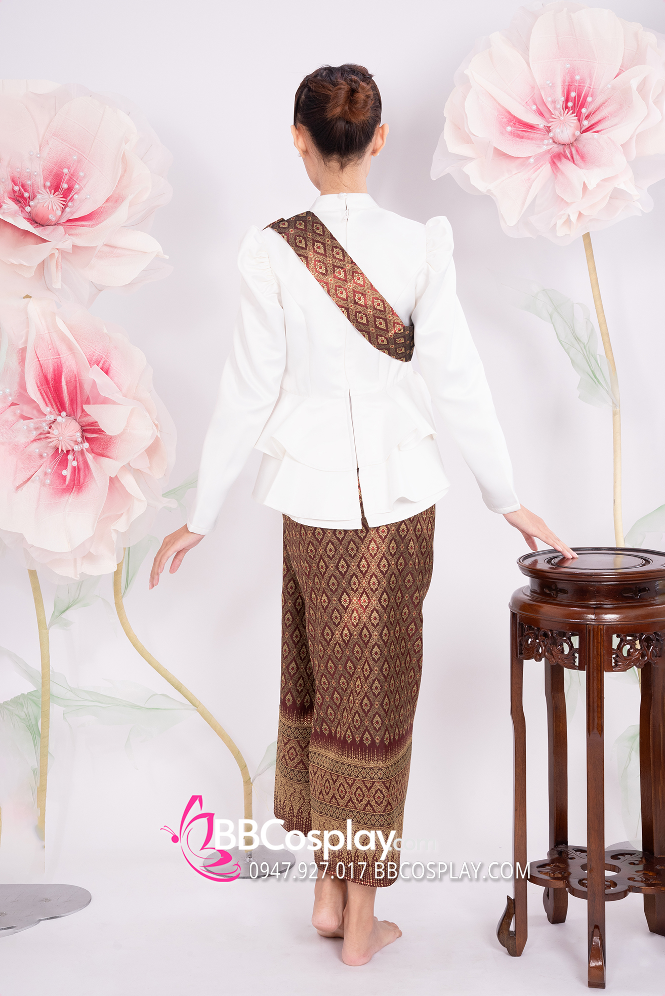 Trang Phục Khmer Áo Trắng Váy Gấm Nâu Kèm Khăn Vai