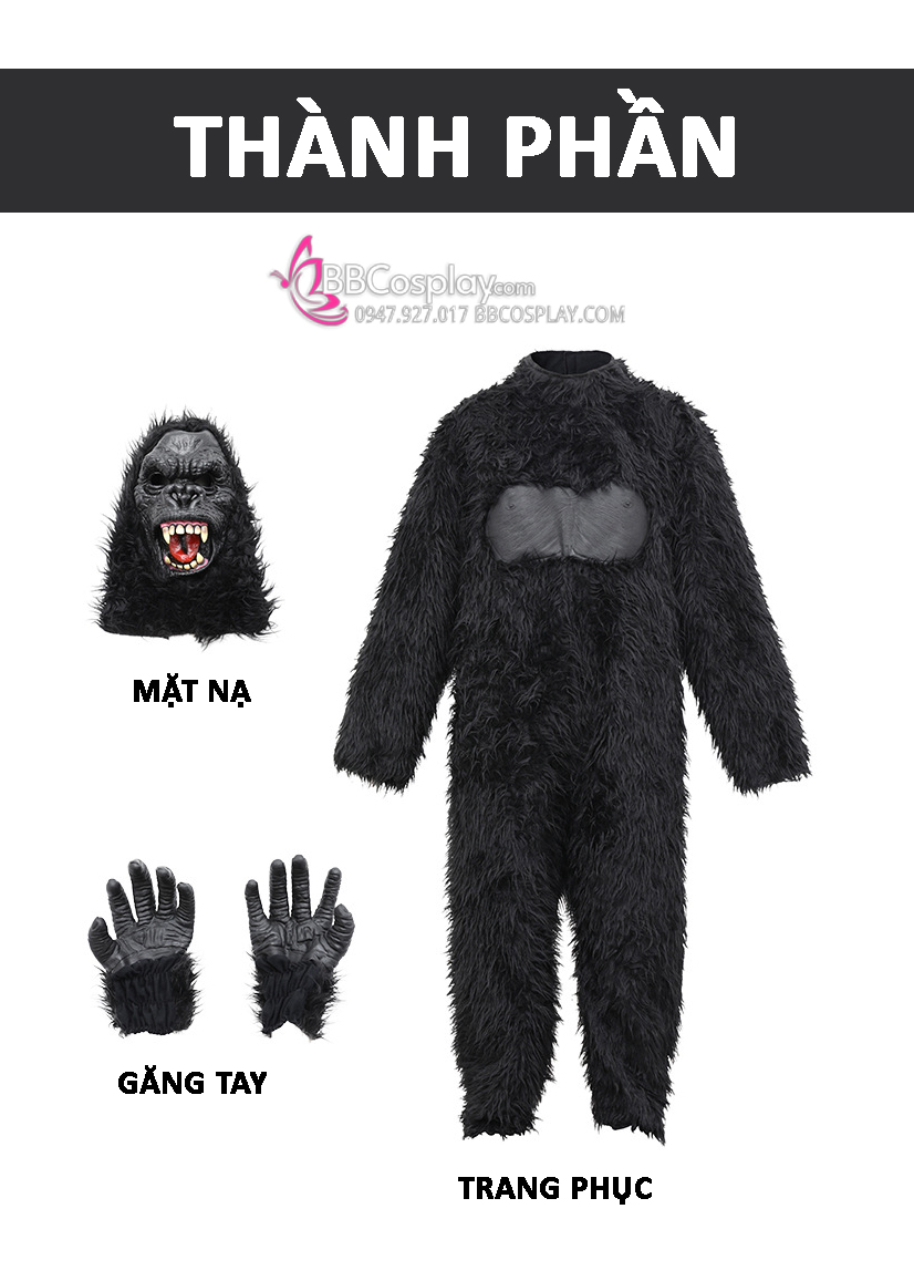 - Thành phần: trang phục áo liền quần + 2 găng tay khỉ + đầu khỉ
