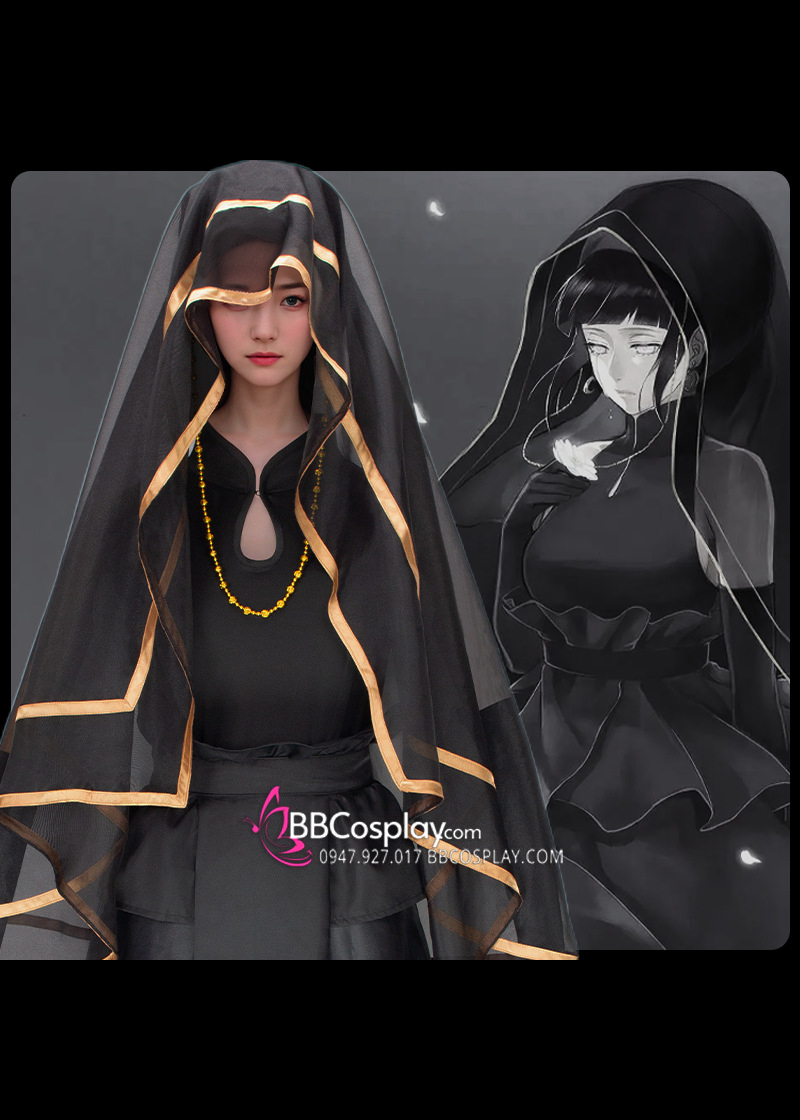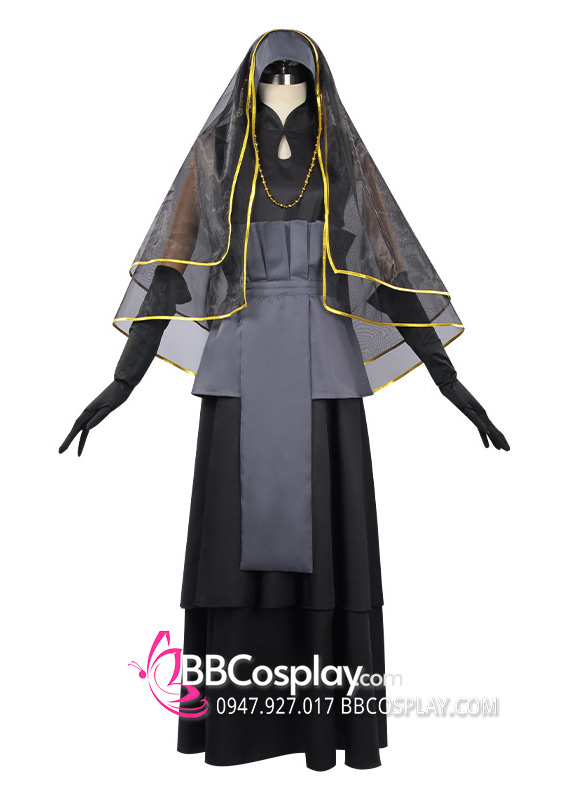 - Thành phần: đầm + 2 voan trùm đầu + thắt lưng xám + găng tay đen + vòng cổ vàng + nón