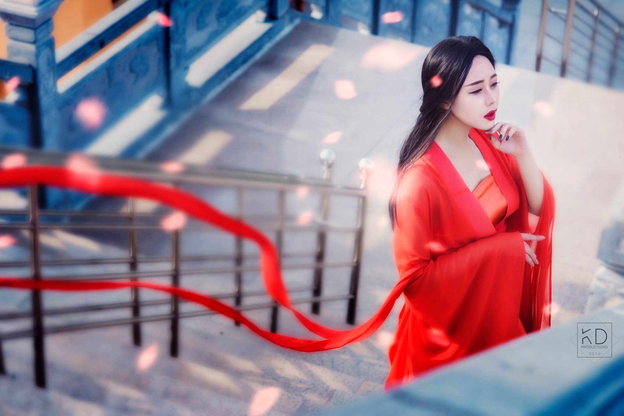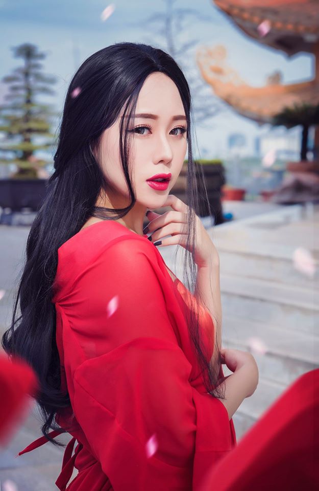 yếm phi đỏ + váy phi đỏ dài + áo voan đỏ + đai đỏ trơn