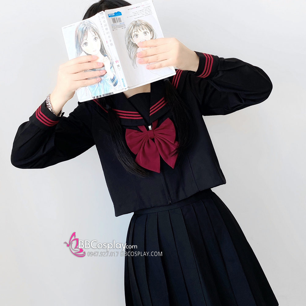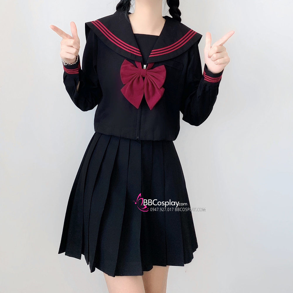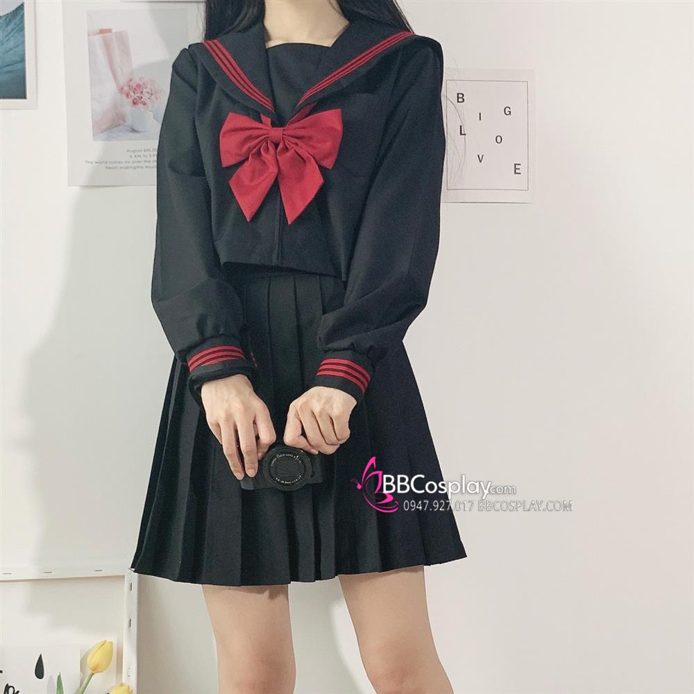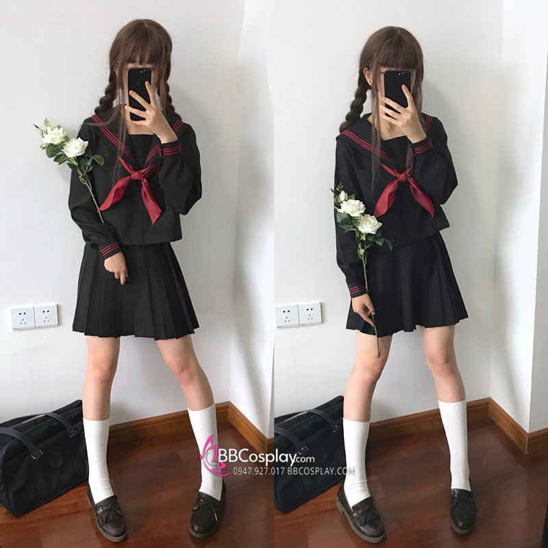 Đồng Phục Nữ Sinh Áo Đen Sọc Đỏ Tay Dài - Kèm Khăn Quàng Đỏ