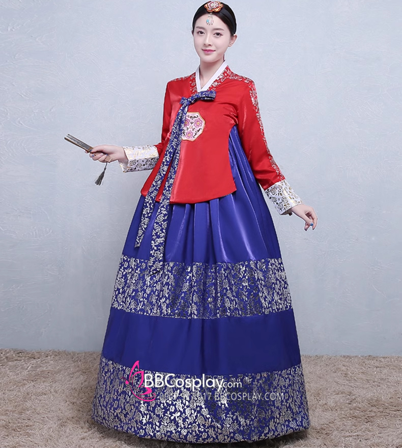 Hanbok Áo Đỏ Váy Xanh Gấm In Nhũ
