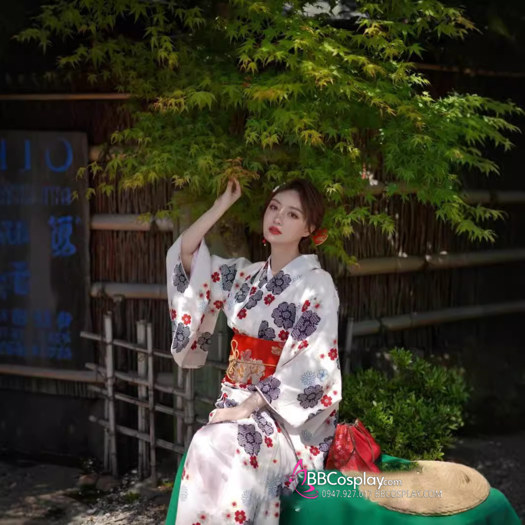 Yukata Trắng Kem Hoa Đen Đỏ