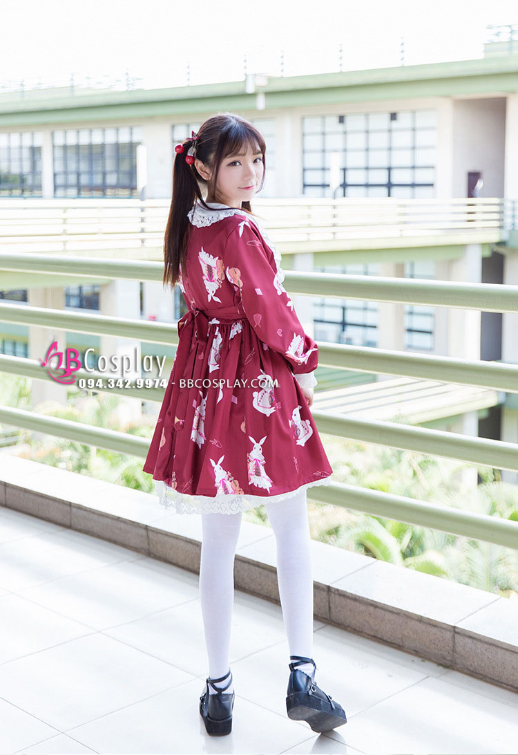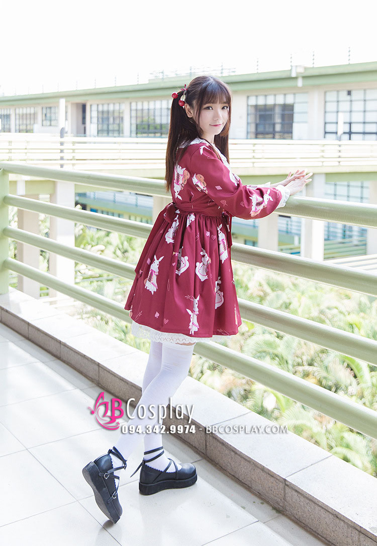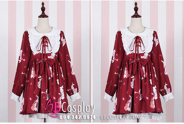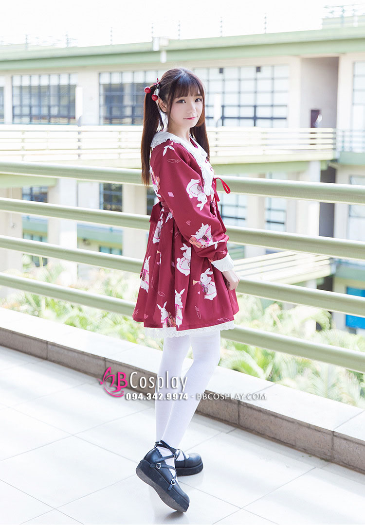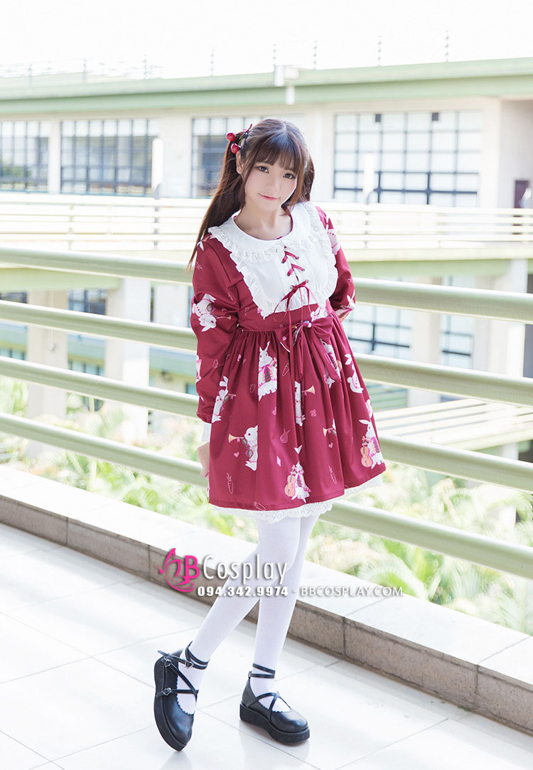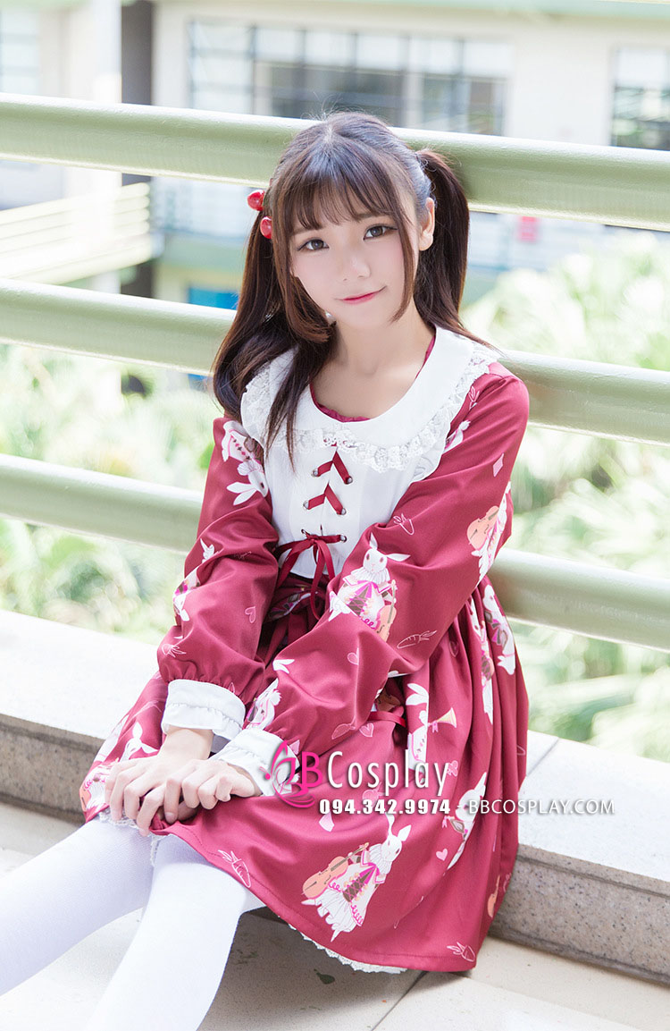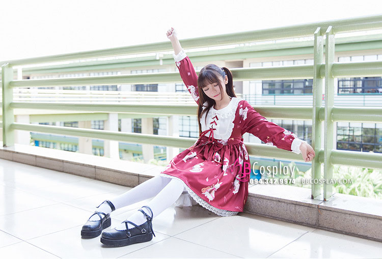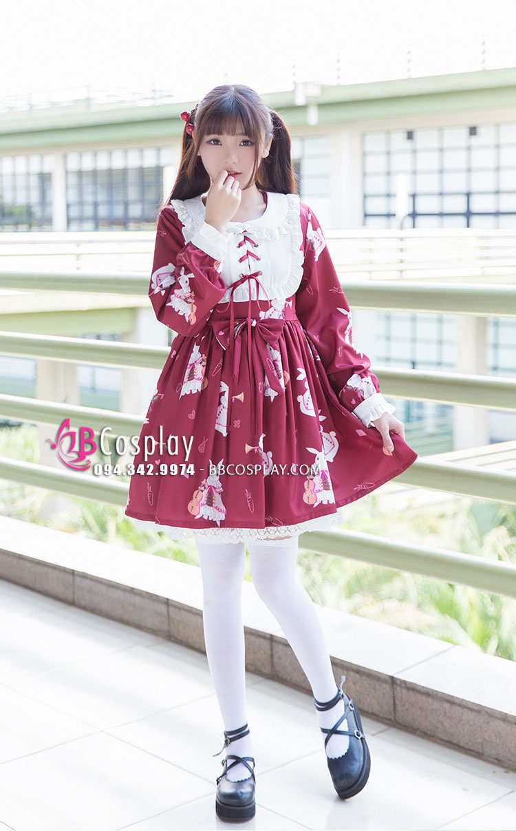 Trang Phục Lolita Đen Trắng Thêu Hoạ Tiết Chân Mèo Kèm Chuông Cổ