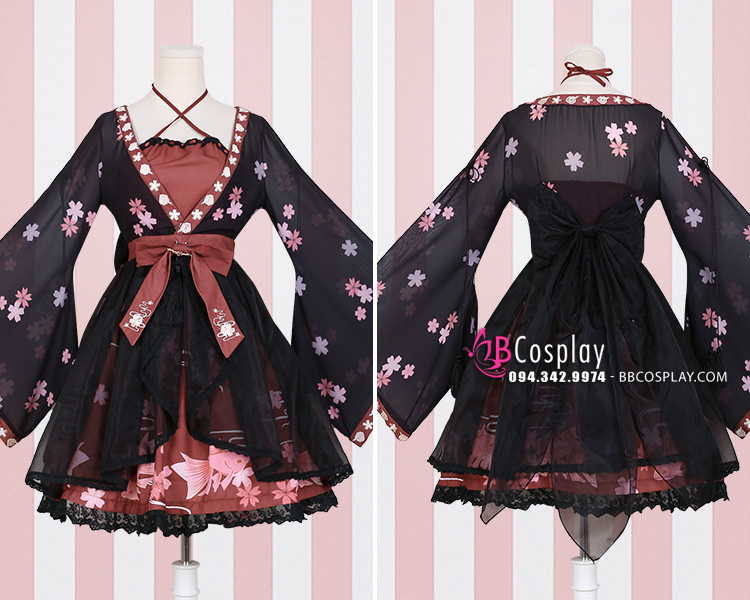 Phần váy được làm bồng, có ren, xòe: hội đủ phong cách lolita. Nhưng phần hoa văn in trên áo là hoa đào, loài họa biểu tượng của Nhật Bản. Tay áo lại thiết kế kiểu dài - rộng theo phong cách waloli Nhật.