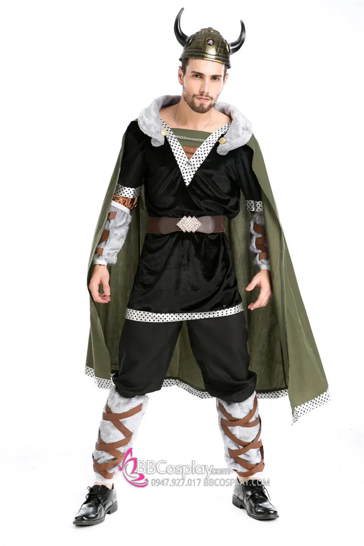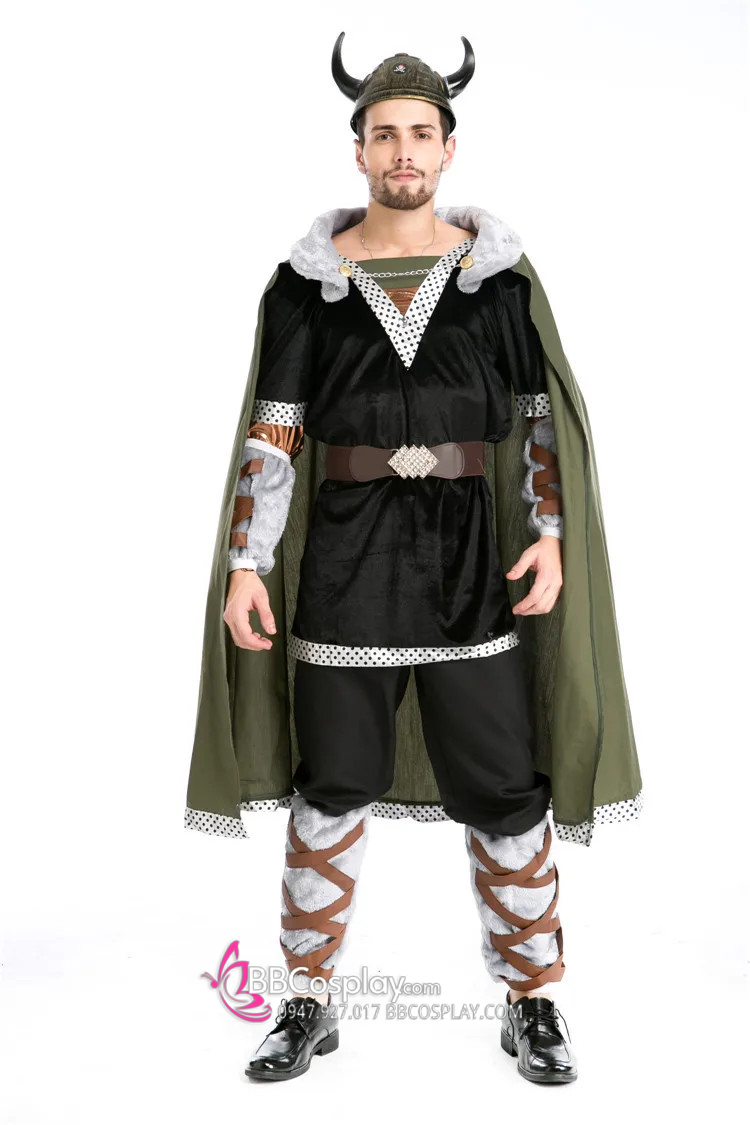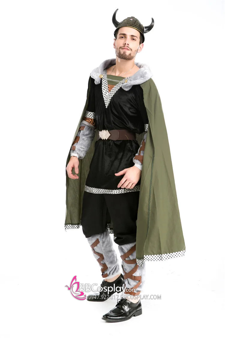 Thành phần: áo choàng xanh rêu viền lông + áo trong + quần + thắt lưng đính đá + 2 băng tay + 2 băng chân + nón viking sừng trắng