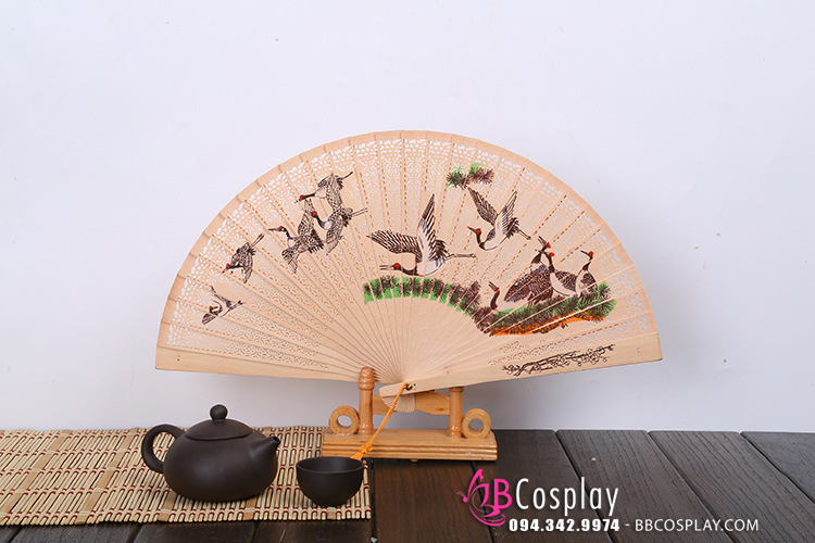 Mô tả: quạt gỗ Trung Quốc, màu gỗ trợ nhiên, Có mùi trầm hương hoặc mùi tràm. Hương thơm dịu nhẹ! in 11 con Sếu màu