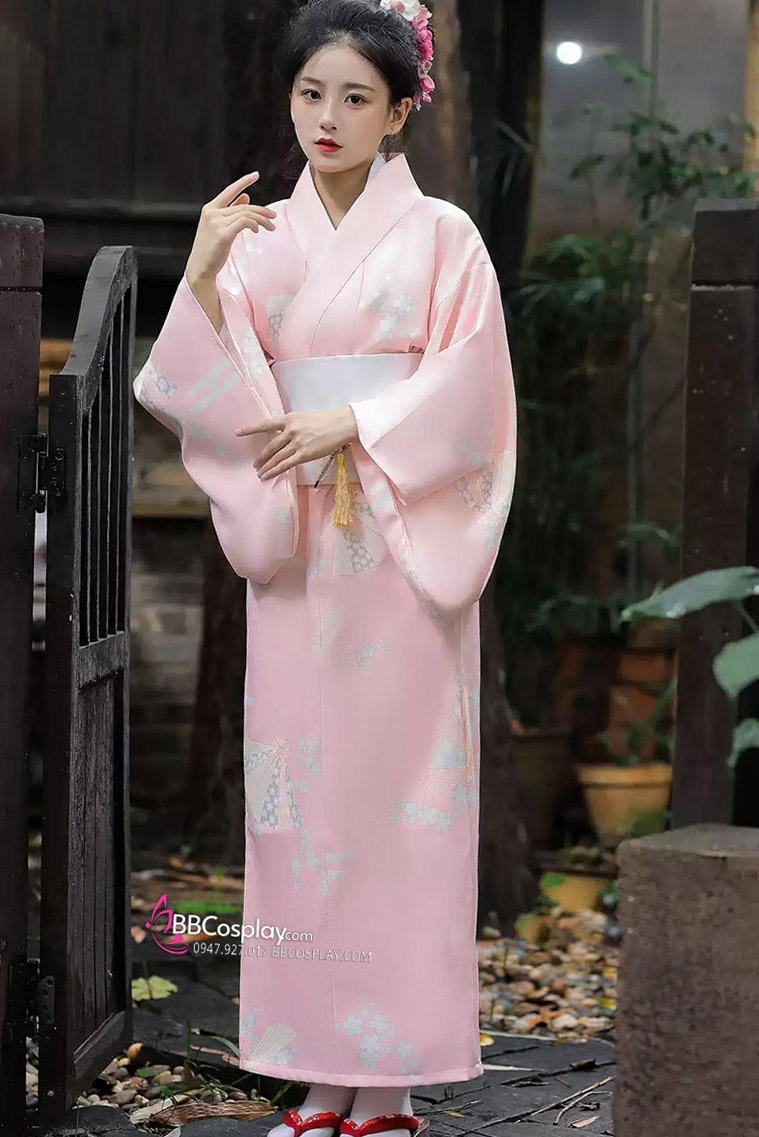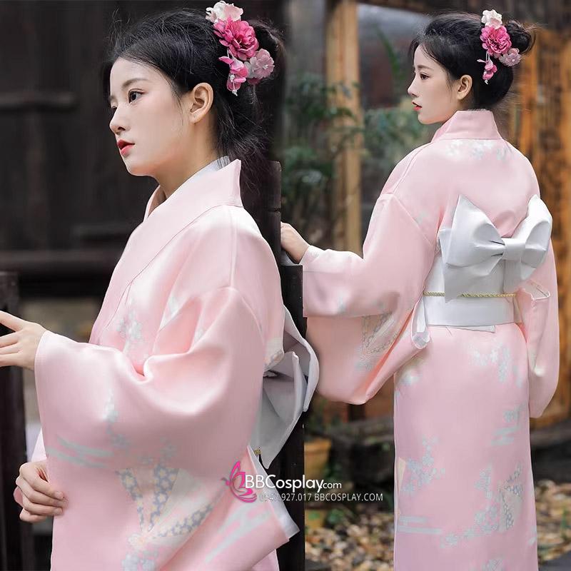 Áo Yukata Hoạ Tiết Hoa Và Quạt Nền Hồng Tặng Kèm Thắt Lưng