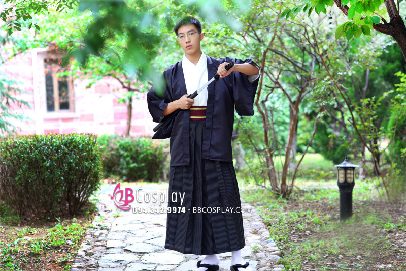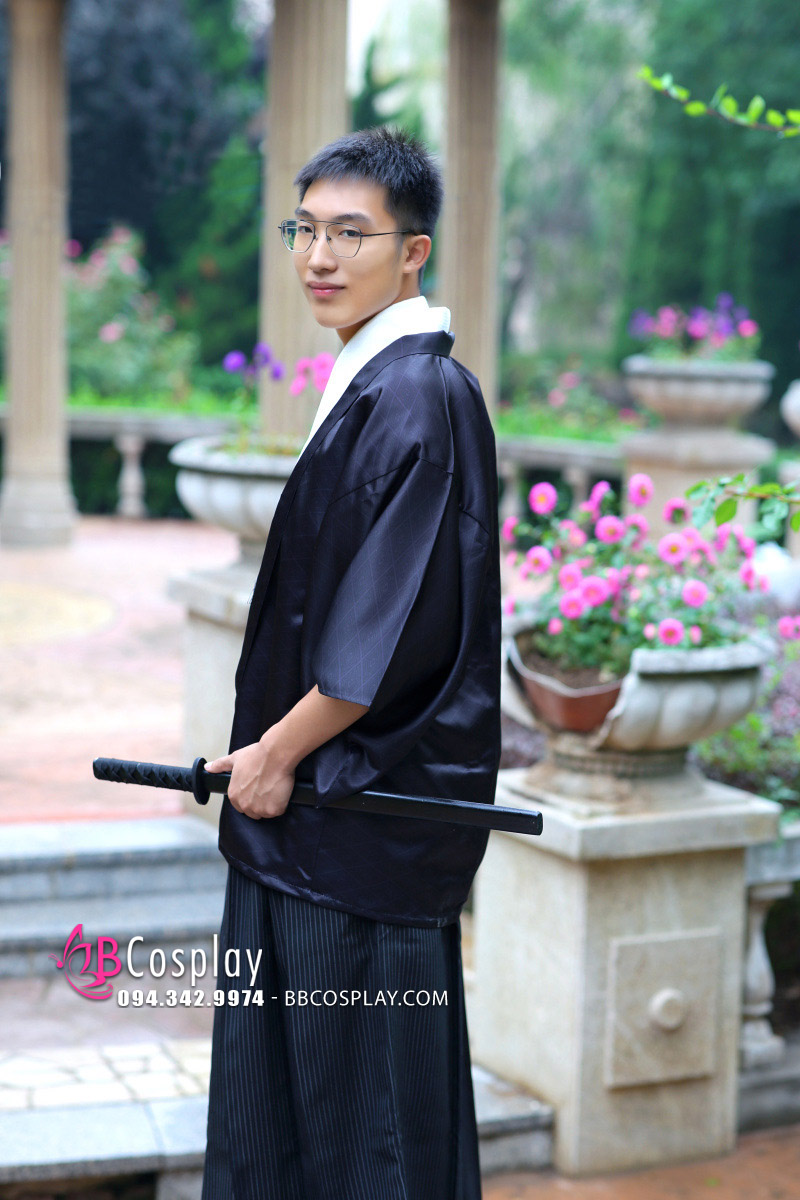 áo trắng + hakama đen chuẩn nhật + haori đen + thắt lưng + (cho mượn kèm đai phụ)