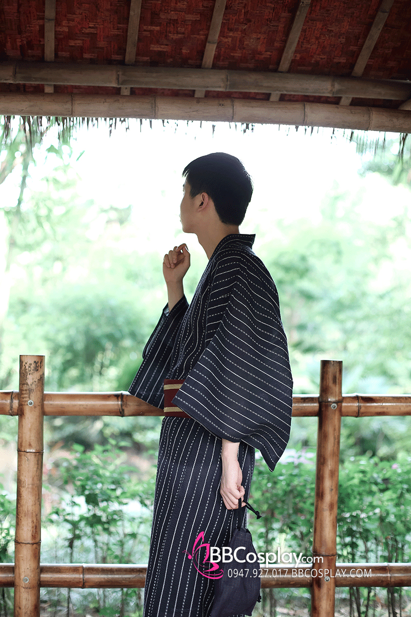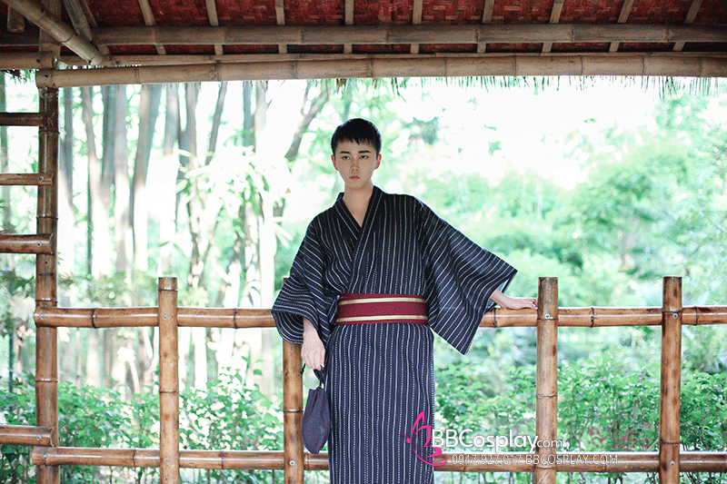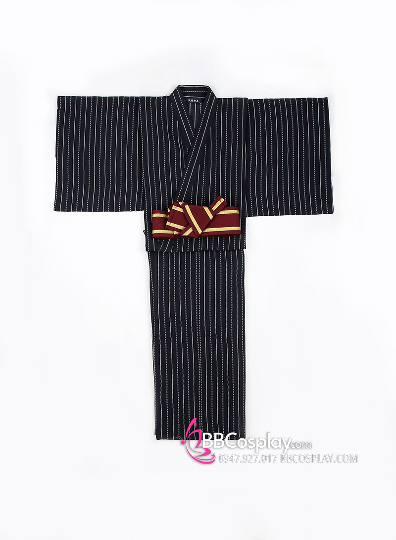 Yukata Nhật Xanh Đen Obi Đỏ Đô Viền Vàng