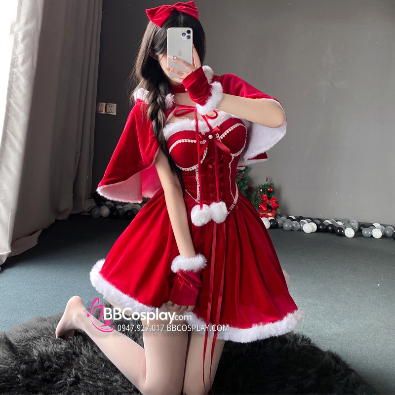 Trang Phục Noel Dáng Cúp Ngực Có Kèm Choàng Nhỏ Lót Lông Mịn