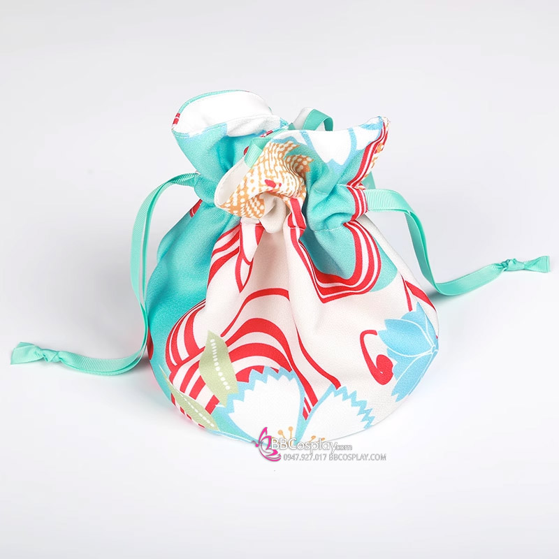 Túi Kinchaku - Túi Thơm Đi Kèm Yukata Nhật Xanh Phối Hoa