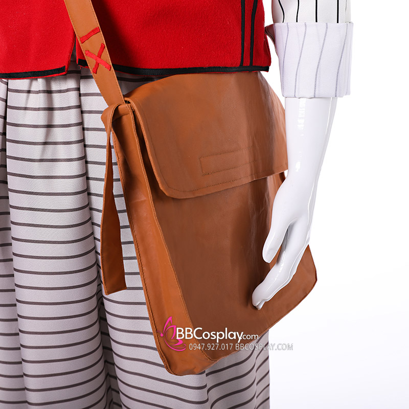 Thành Phần: áo trắng kẻ sọc tay dài + quần xám sọc ngang đen + khoác đỏ + túi nâu + nón nhung tím