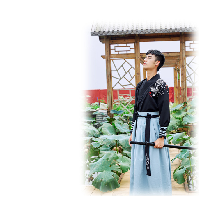 Áo đen thêu rồng + váy xanh đá