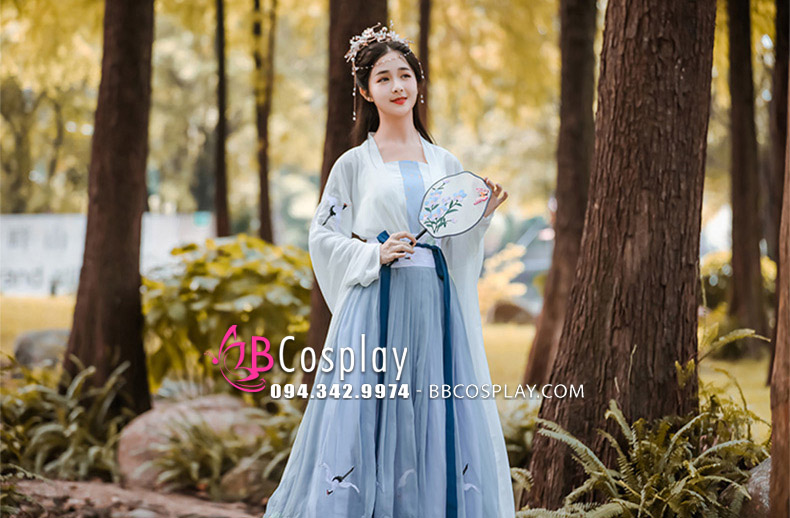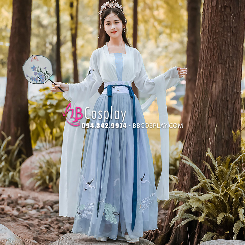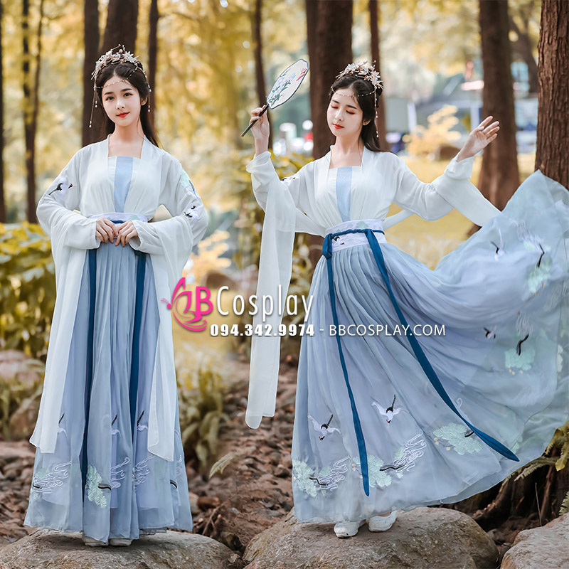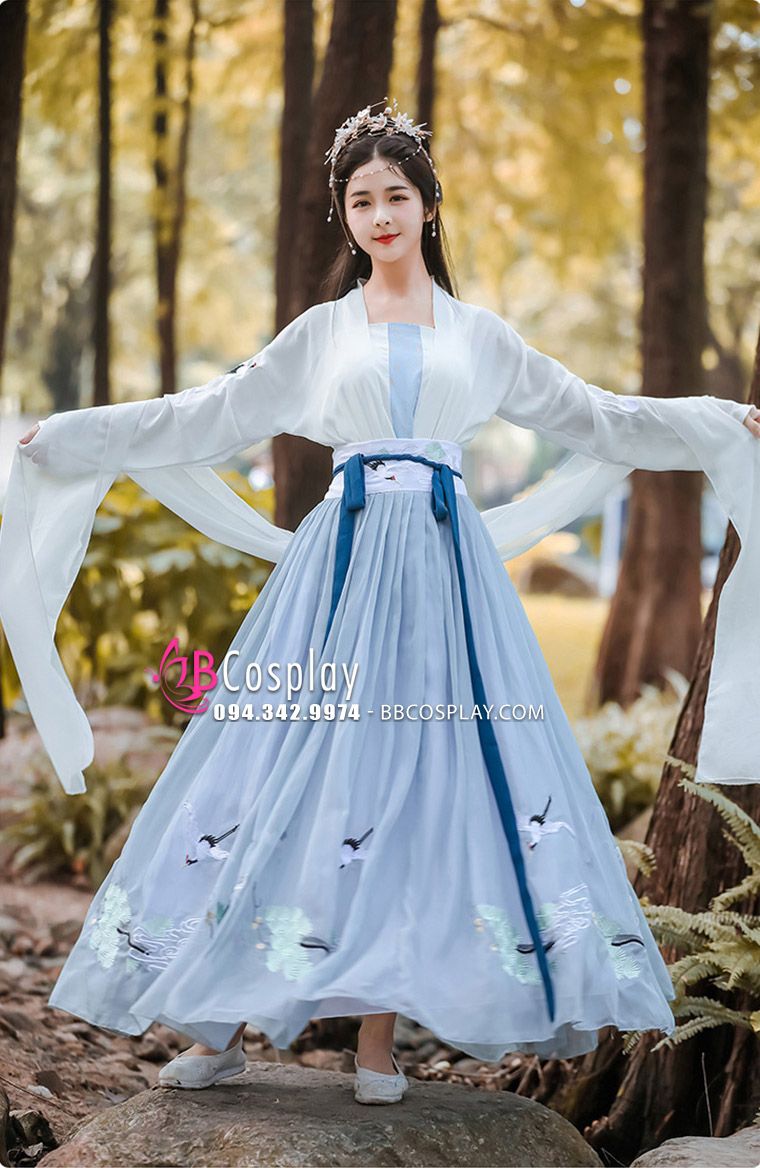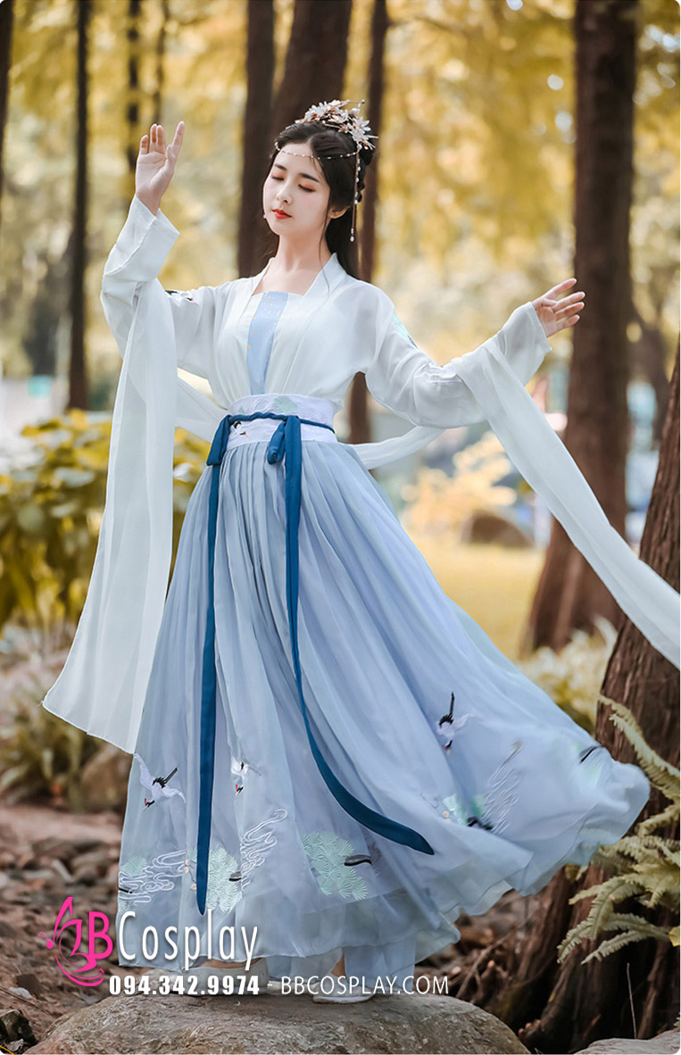 Hán phục Bạch Hạc Du Tiên sẽ đem lại sự thoải mái cho người mặc vì chất voan, lụa rất thoáng khí và mềm mại. Trang phục bao gồm áo, váy và dây; có nhiều size, phần dây lưng còn có thể tăng giảm tùy ý theo số đo của người mặc.