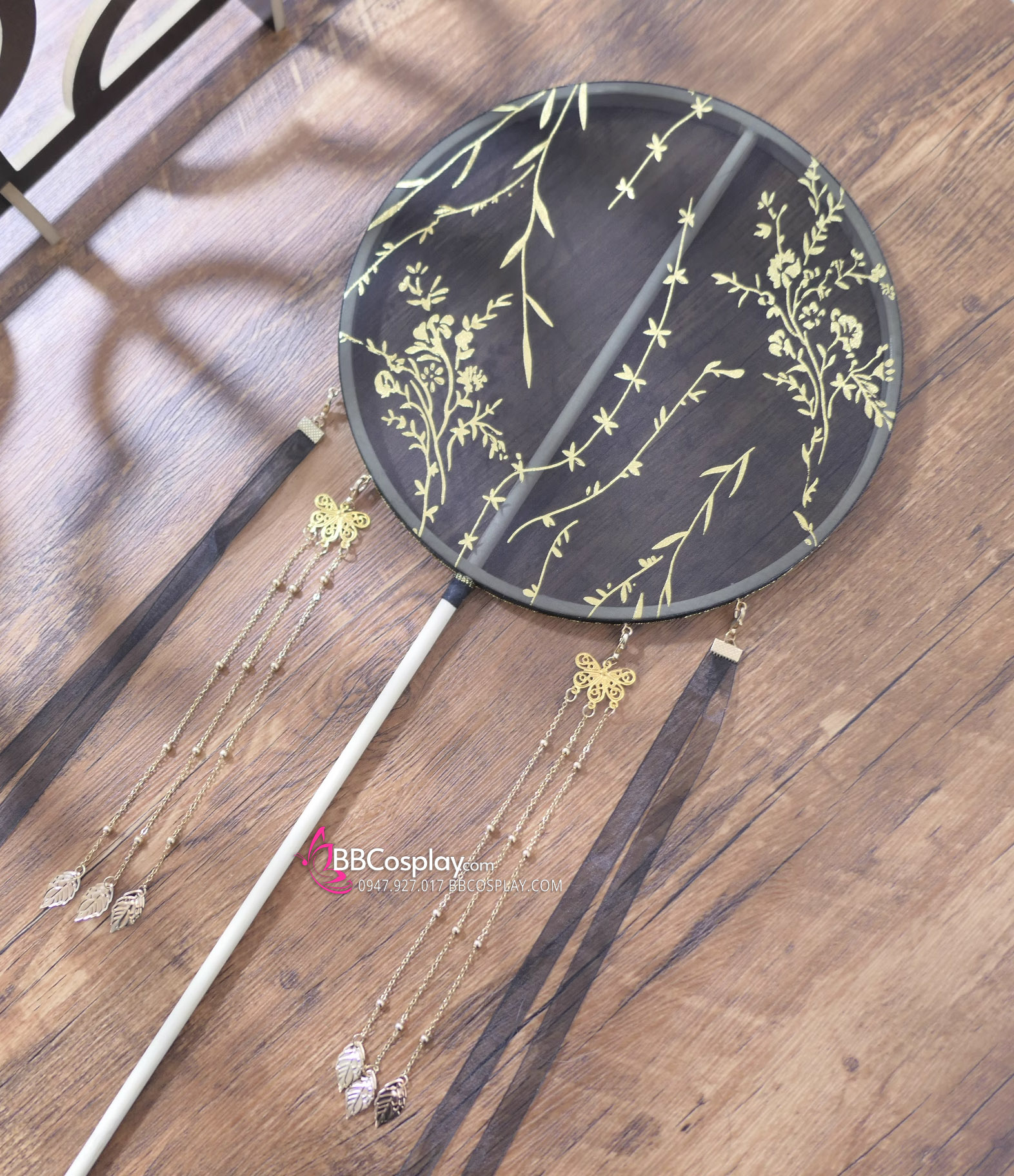 Quạt Mỹ Nhân Cán Dài Nền Đen Nhũ Vàng