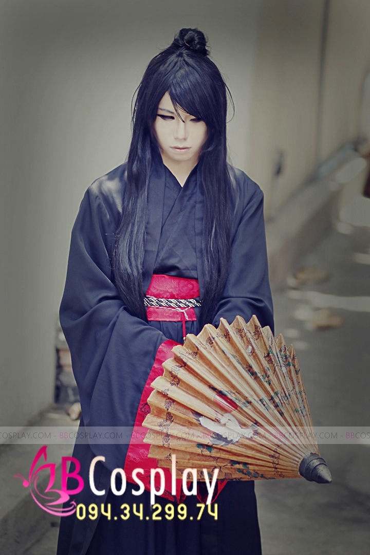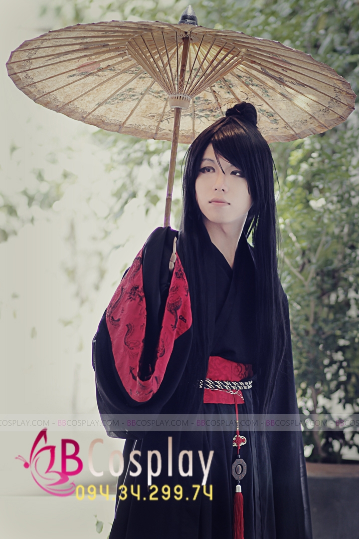 áo phi đen + váy đen dài + áo voan viền gấm + đai gấm đỏ ngang
