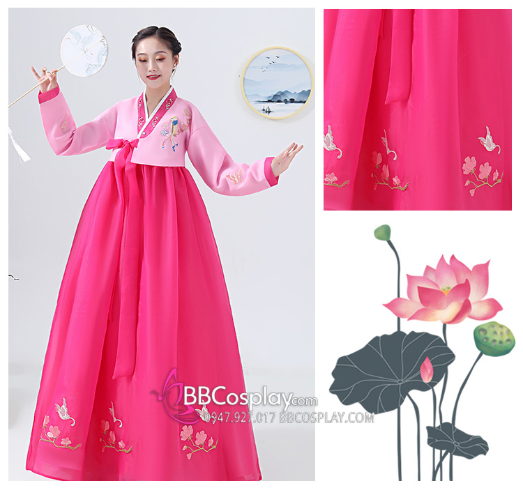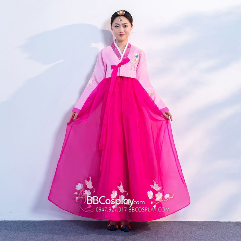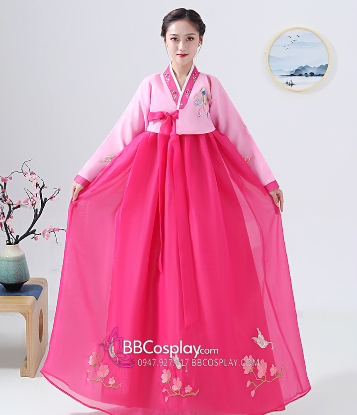 Quần Áo Hanbok Chuẩn Hàn Voan Thêu Hồng Nữ Tính