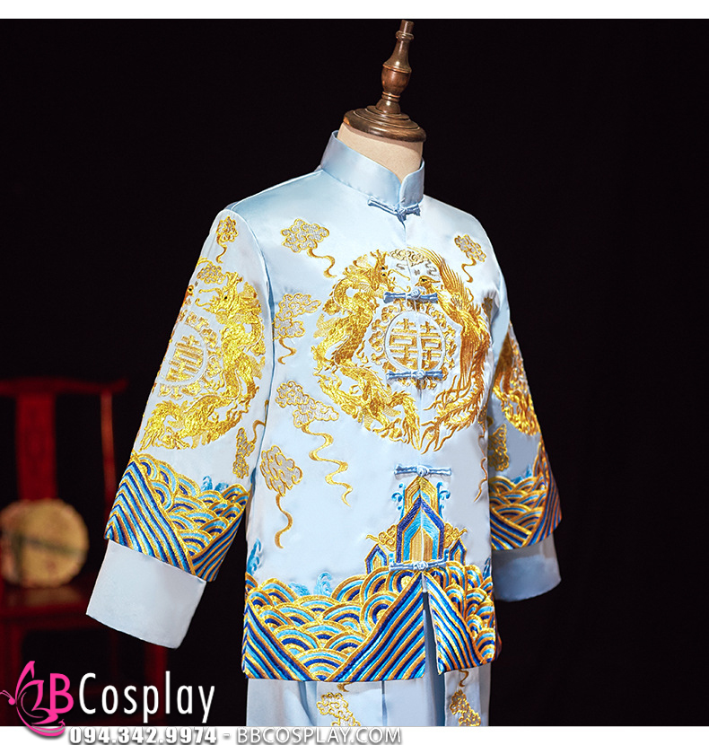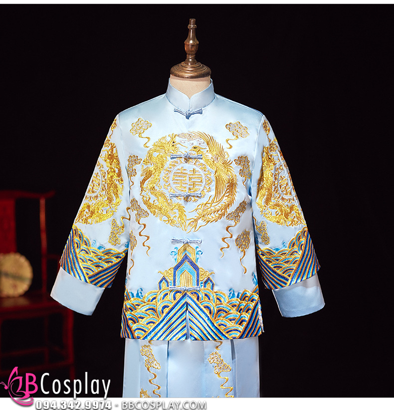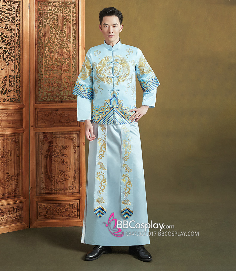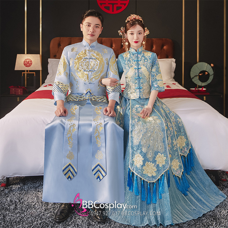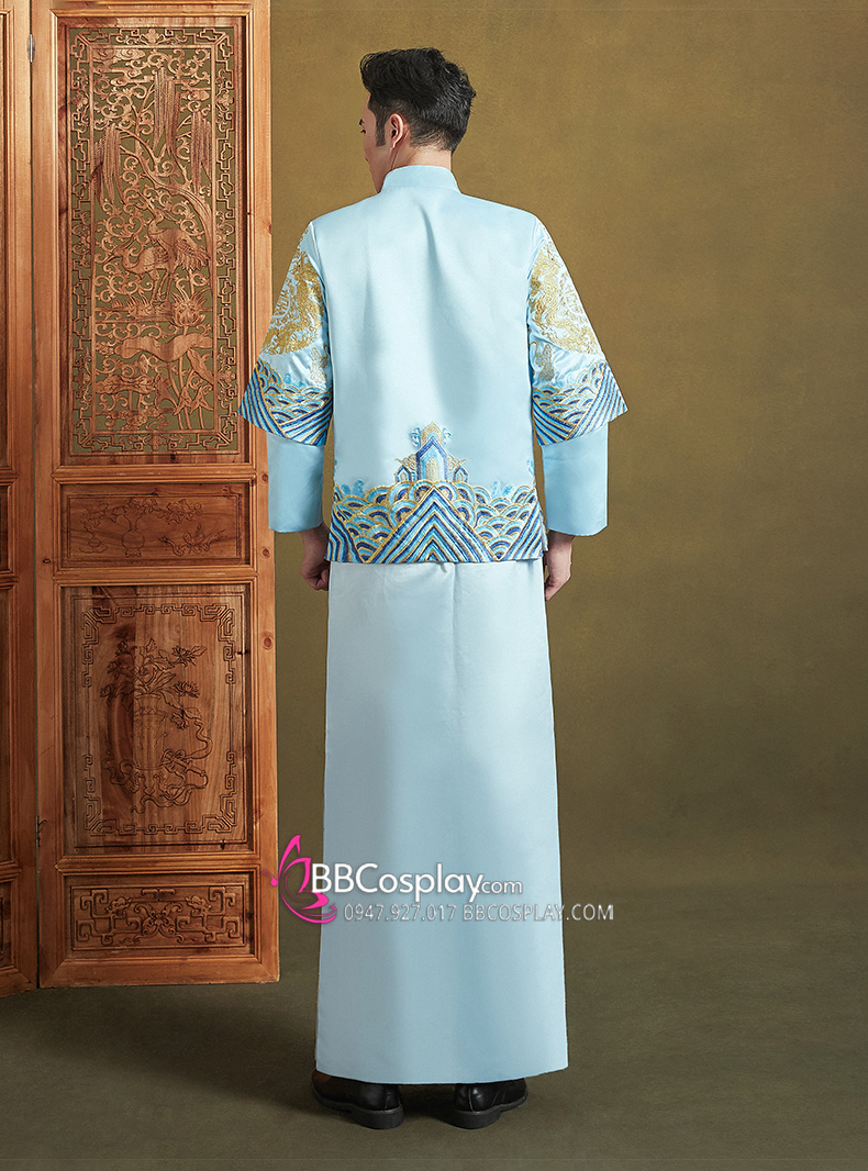 Hỉ Phục Tân Lang Tone Xanh Dương Cặp Long Phục Mới 2024