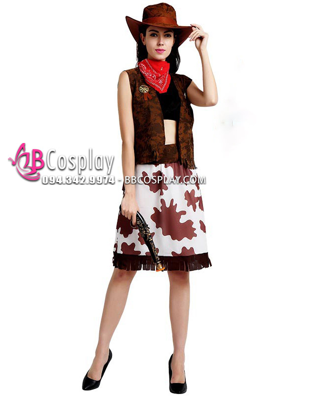 Thành phần: gilê màu nâu bò + váy + khăn đỏ + nón cao bồi