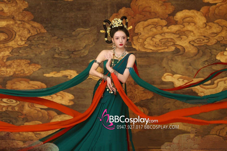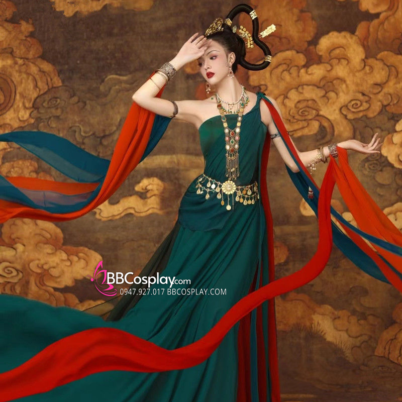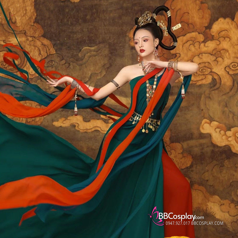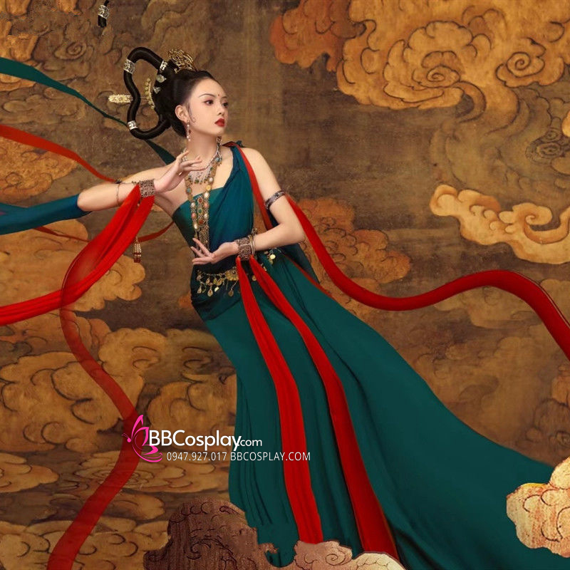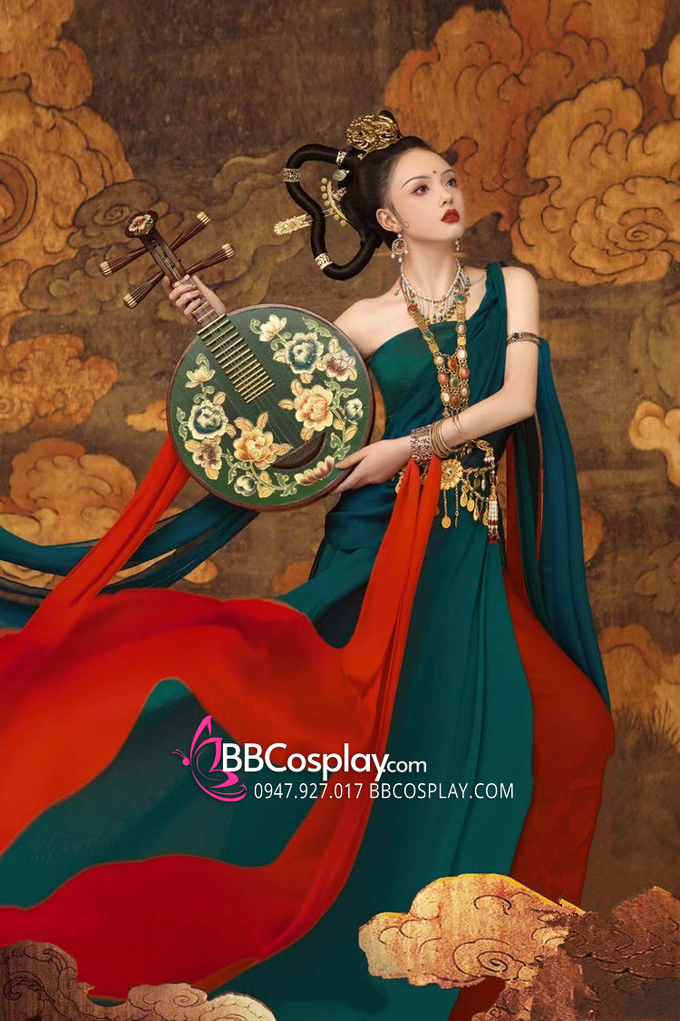 áo croptop xanh rêu + váy 2 lớp xanh đỏ + dây cam + dây đỏ + dây xanh rêu + dây xanh navy + thắt lưng + vòng cổ + cho mượn kèm đàn tỳ bà