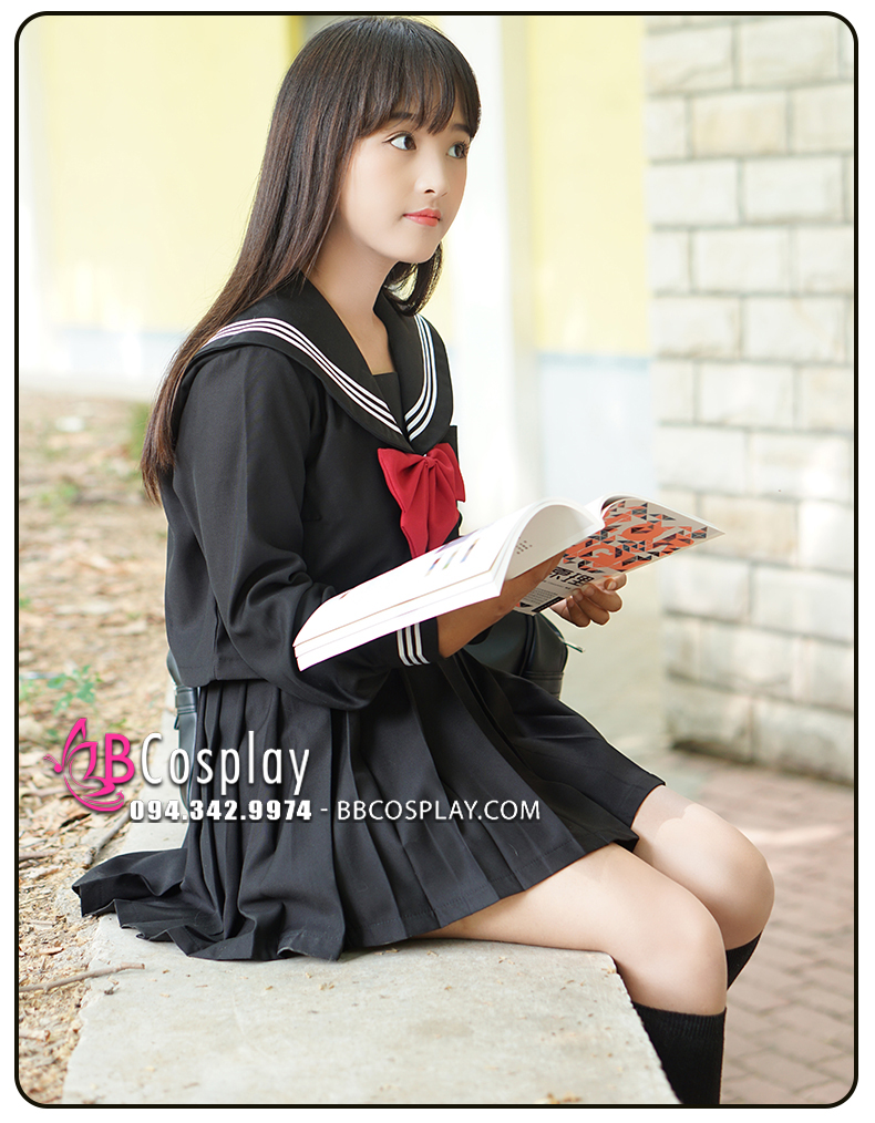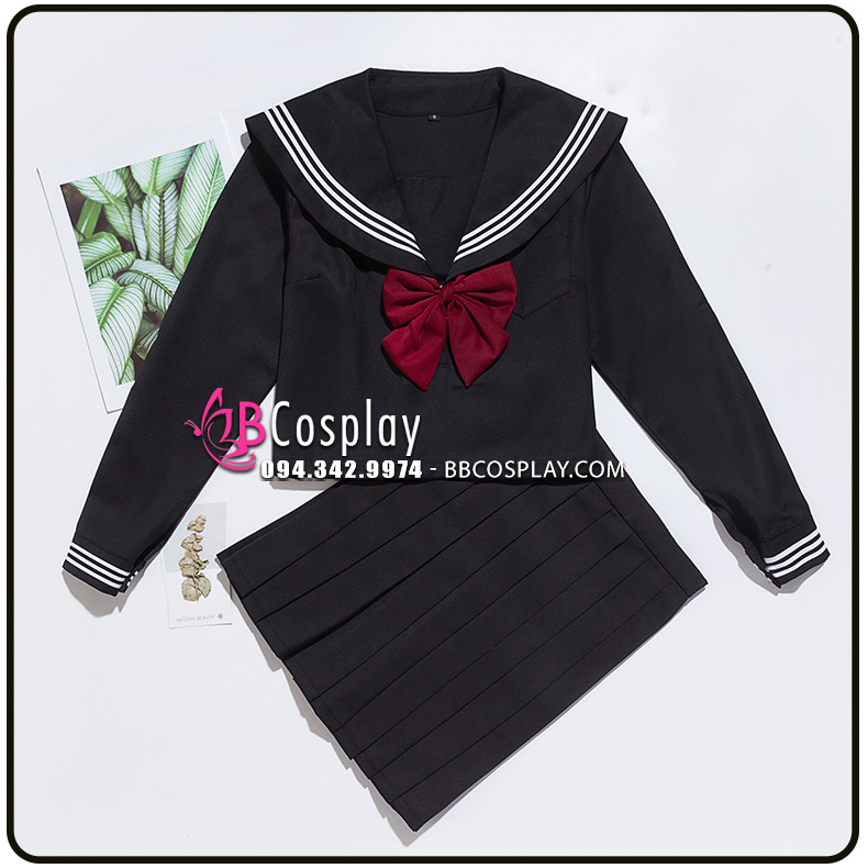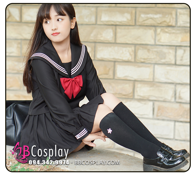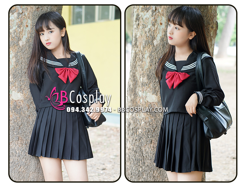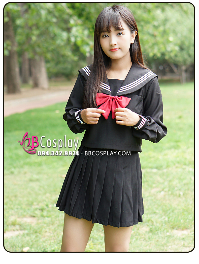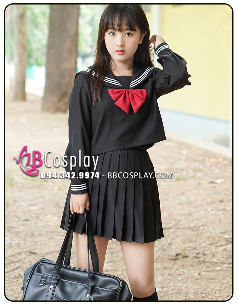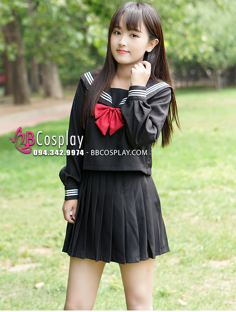 Đồ Seifuku Nữ Sinh Tay Dài Áo Đen Váy Đen - 3 Sọc