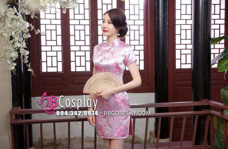 Sườn Xám Hồng Phấn Ngắn In Hoa
