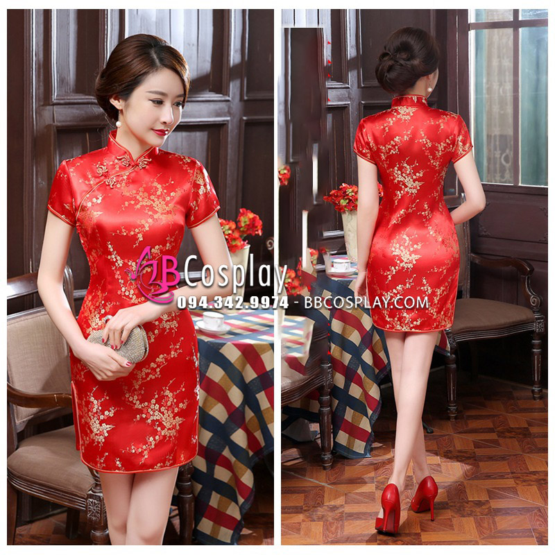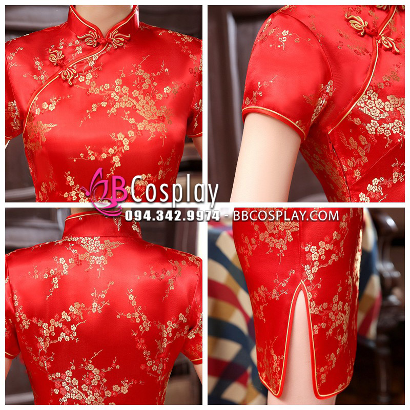 Sườn Xám Đỏ Mai In Hoa
