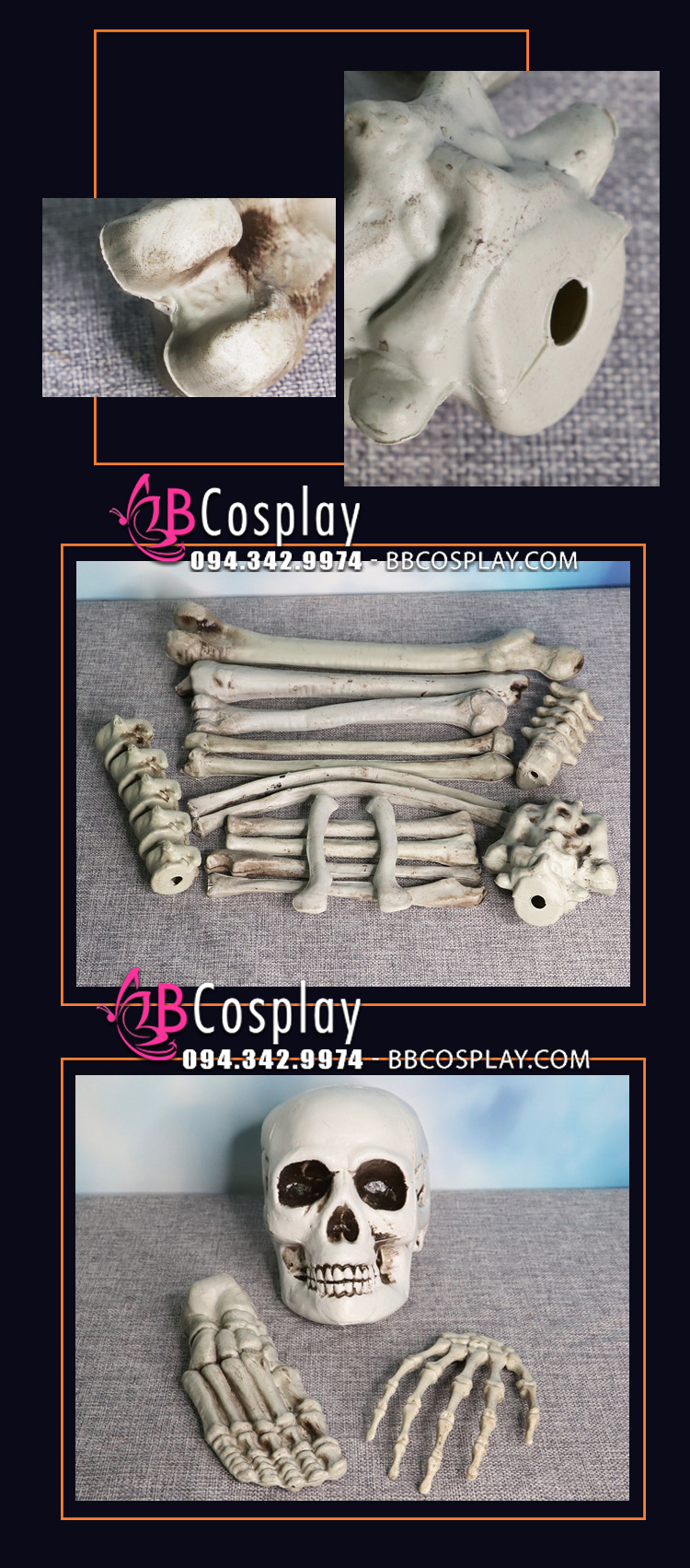 Các thành phần trong bộ xương như ảnh, kích thước thật, tỉ lệ thật như xương người trưởng thành (cao tầm 160cm)