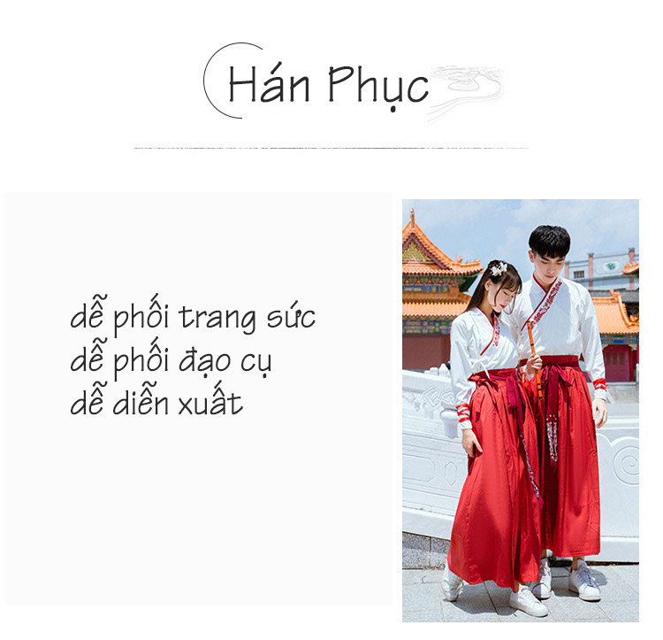 Hán phục sẽ đem lại sự thoải mái cho người mặc vì chất voan, lụa rất thoáng khí và mềm mại. Trang phục bao gồm áo, váy và dây; có nhiều size, phần dây lưng còn có thể tăng giảm tùy ý theo số đo của người mặc.