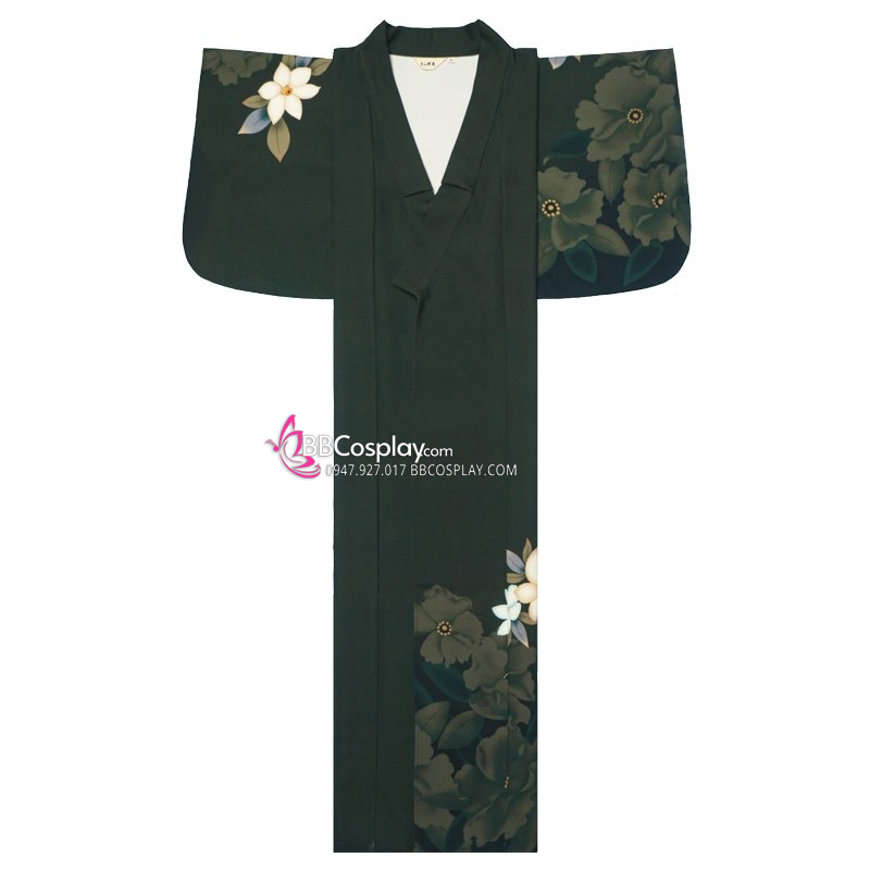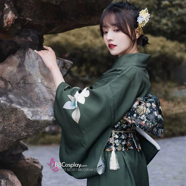 Yukata Xanh Rêu Hoa Trắng Tặng Kèm Thắt Lưng