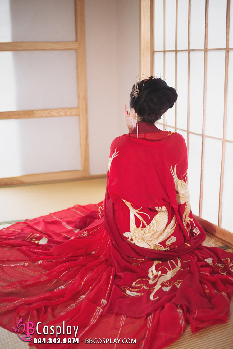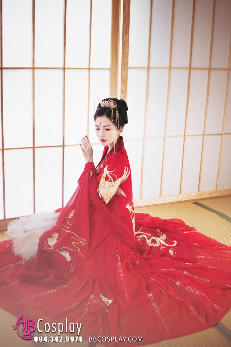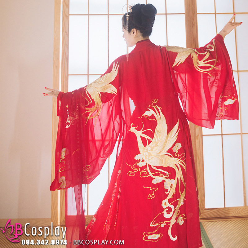 áo đỏ đắp chéo + váy đỏ thêu hoa + choàng thêu phượng hoàng